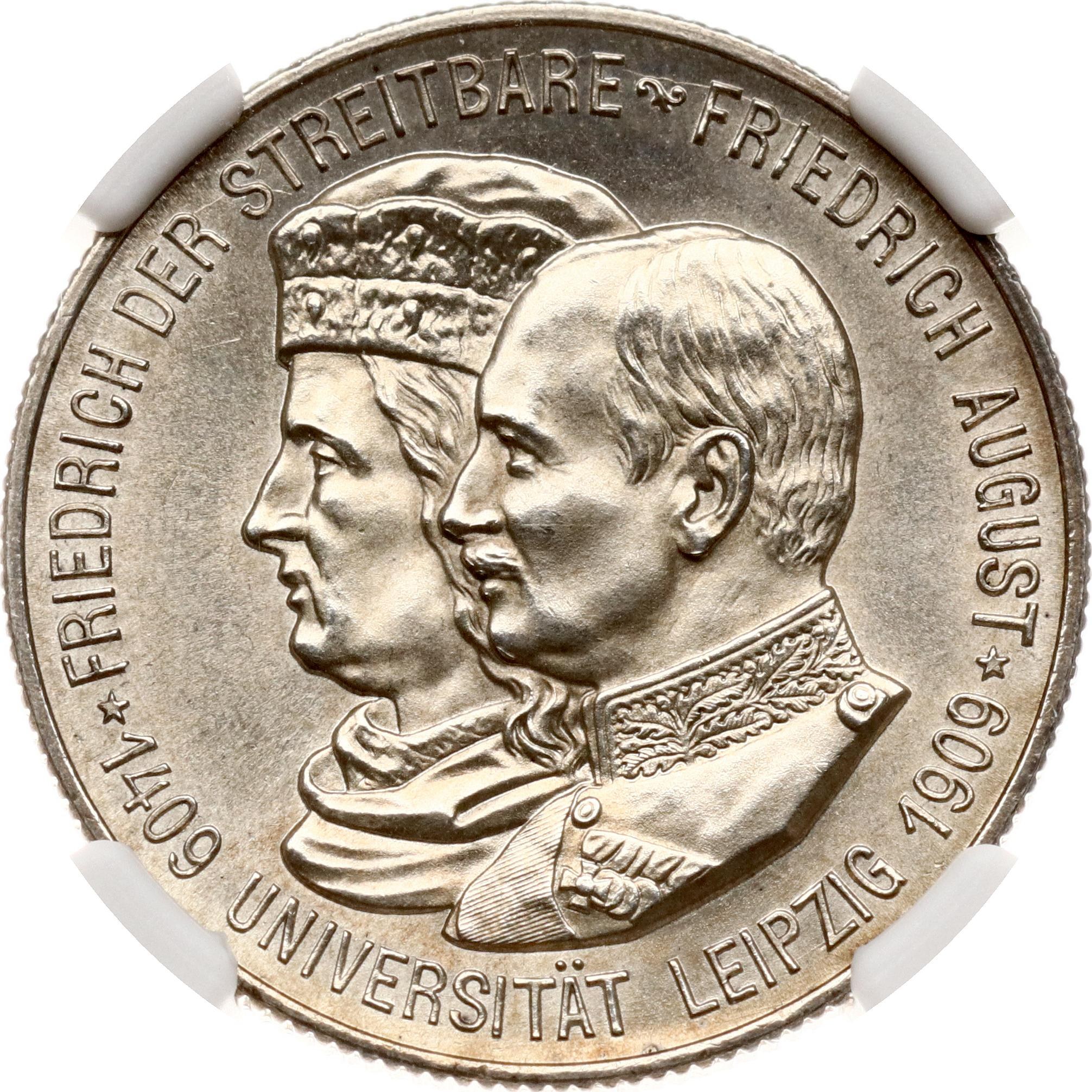 Germany, Saxony. Friedrich August III (1904-1918). 2 Mark 1909 E, 500th Anniversary of the Leipzig University. Silver. KM 1268. NGC MS 62.