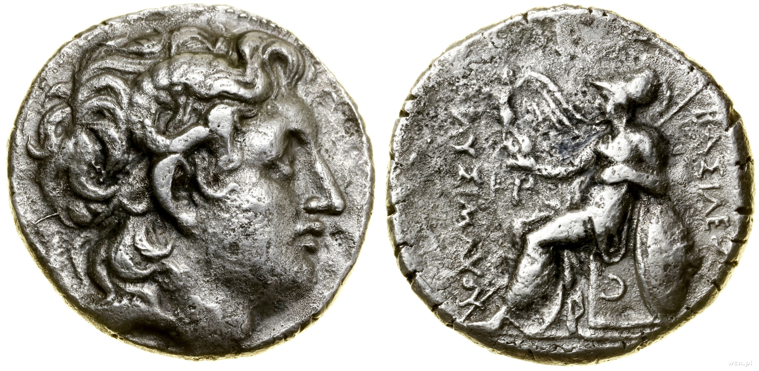 Aw: Głowa Aleksandra Wielkiego w prawo, Rw: Atena Nikeforos siedząca w lewo, trzymająca włócznię i Nike, u boku tarcza, po bokach ΒΑΣΙΛΕΩΣ ΛΥΣΙΜΑΧΟΥ, z lewej monogram HP, pod tronem ɔ