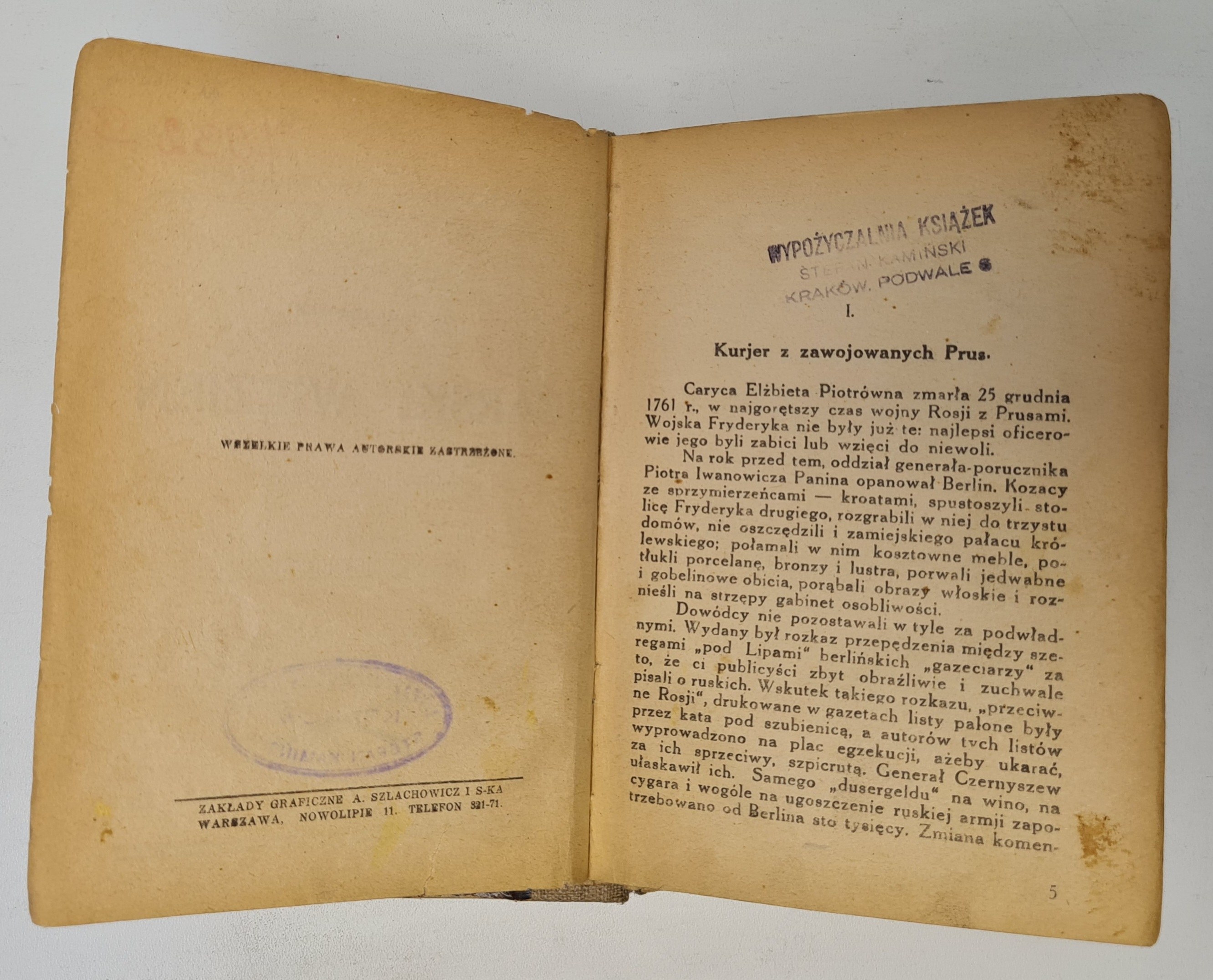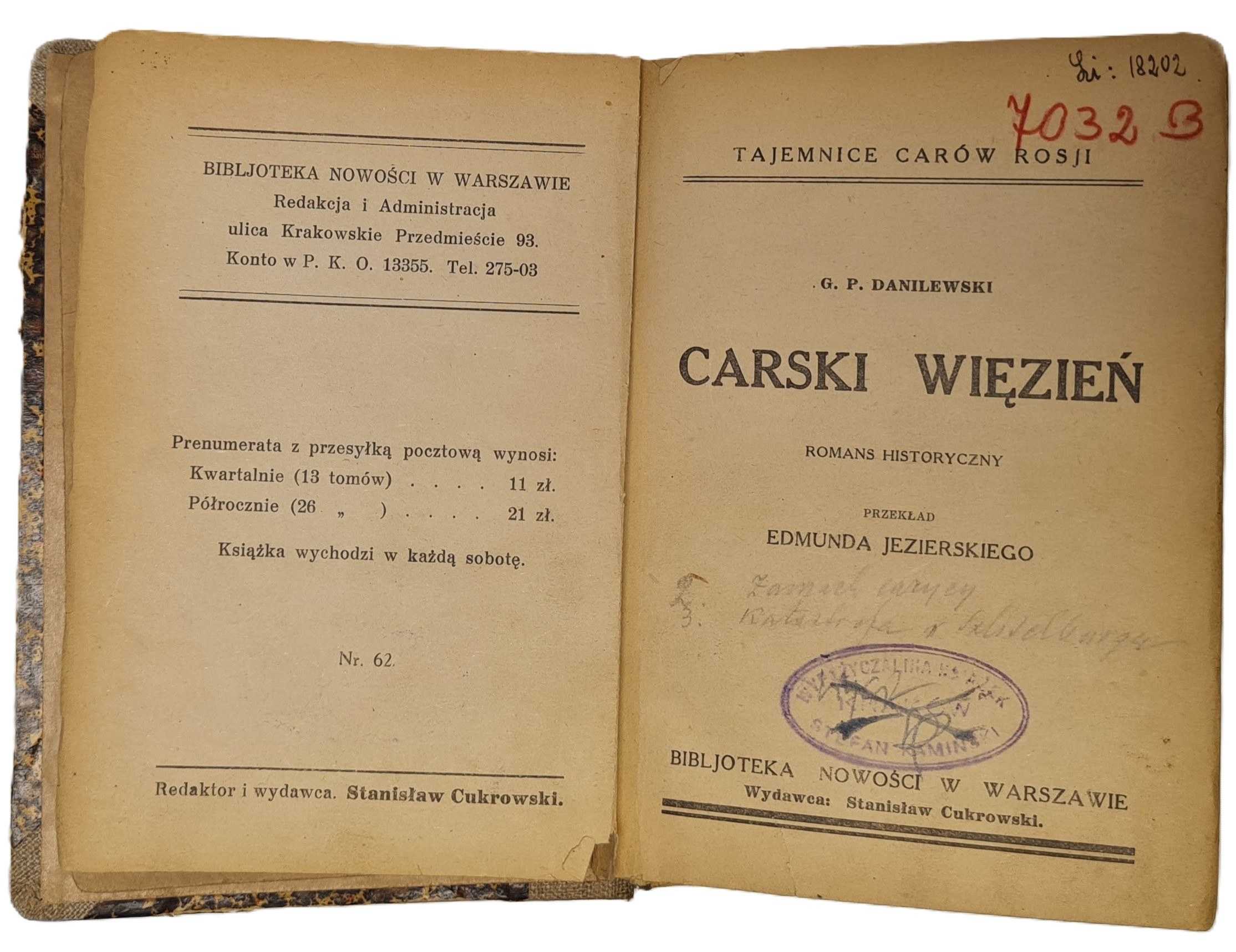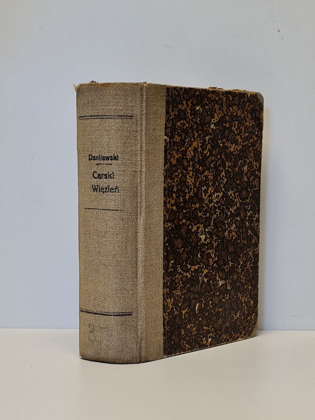 Danielewski G. P. - Carski więzień. Romans historyczny , Warszawa [b.r], Biblioteka nowości w Warszawie. Przekład Edmunda Jezierskiego. wym.13x17,5cm. s.171. Oprawa introligatorska półpłótno i marmurkowy papier z nieznacznymi przetarciami na brzegach, niewielki ubytek płotna na grzbiecie. Na wyklejce numer kredką. Str. tyt. numer kredką oraz piórem i skreślona pieczęć wypożyczalni. Pęknięty blok. Stan dobry