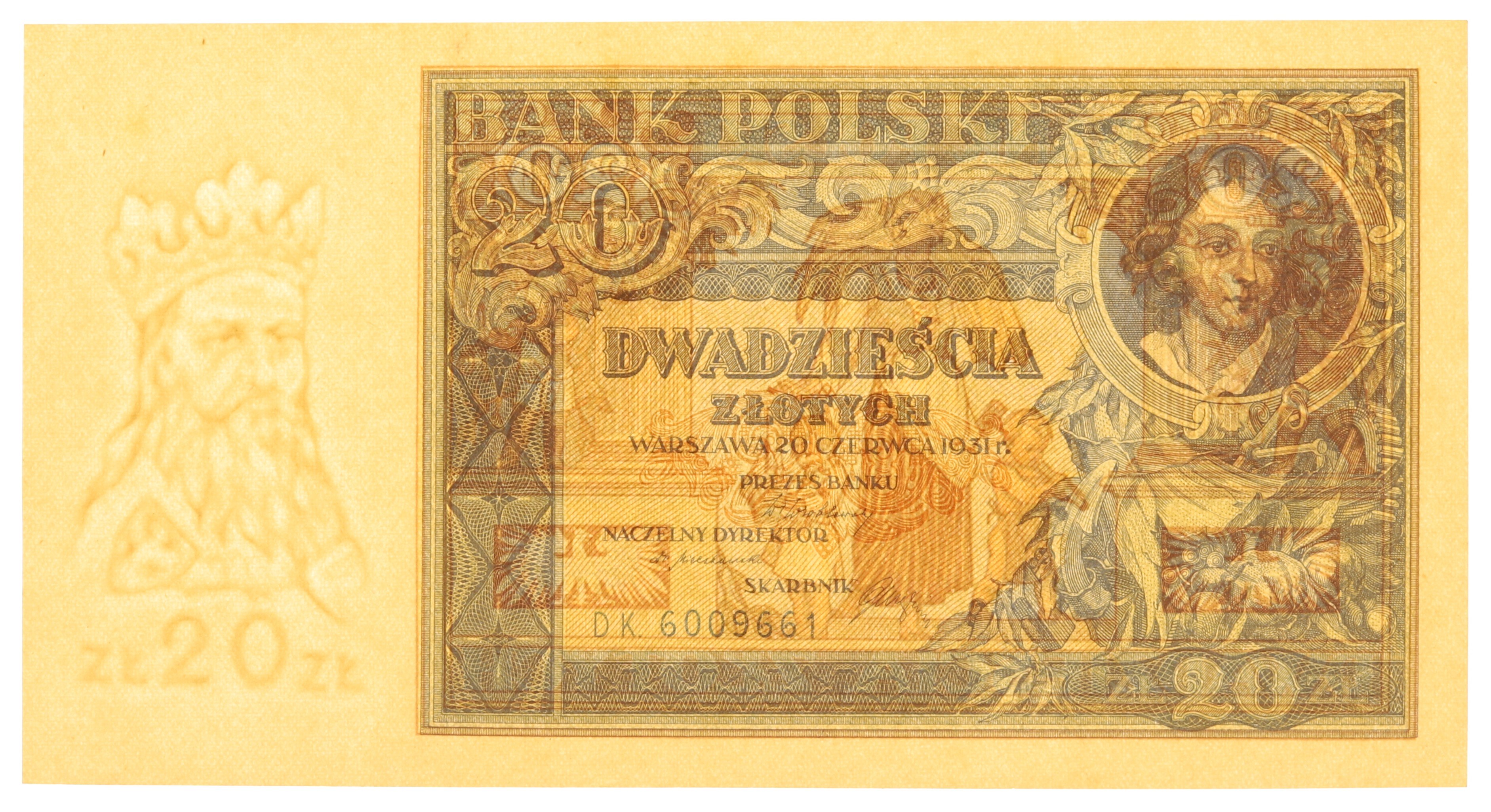 Banknot autorstwa Ryszarda Kleczewski, znak wodny w niezadrukowanym polu wizerunek Kazimierza Wielkiego.