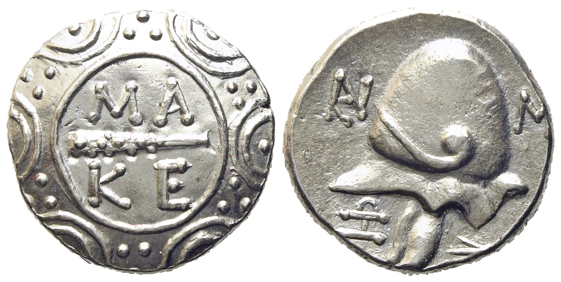 Pella or Amphipolis. Struck 184-179 c.ca. Zoilis, magistrate. Macedonian shield; on boss, MA/KE above and below club; Rv. Macedonian helmet; three monograms around; to lower right, thunderbolt. AMNG III 2; HGC 3.2, 324. Good extremely fine.