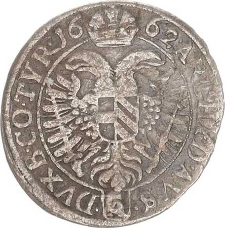 3 kr. 1662 CA, Vídeň-Cetto var.: v Av. perlovcový a hladký kruh, nad hlavou arabeska, opis: LEOPOLDVS.D.G.R.I.S. () . A.G.H.B.REX / datace dělená korunou 16-62 opis: ARCHID. AVS. () . DVX. B. CO . TYR. "R"