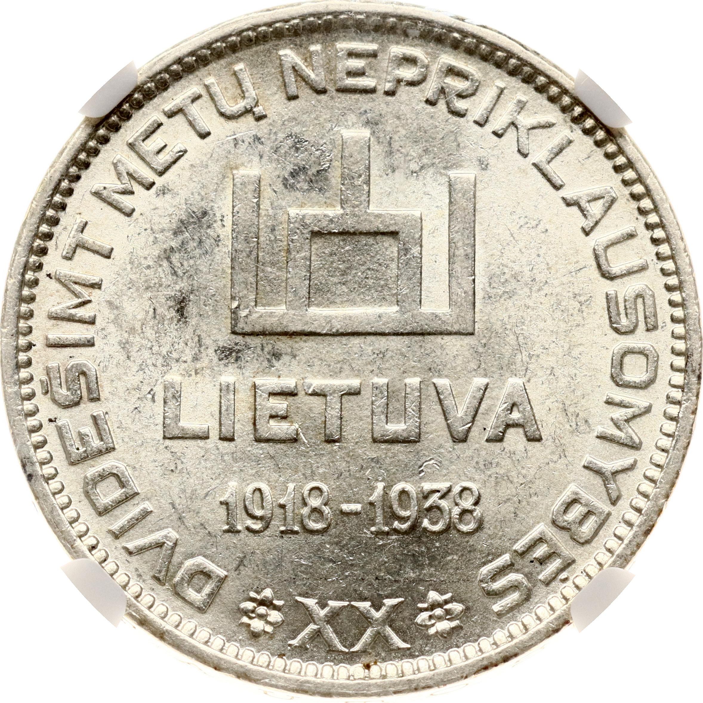 Lithuania. 10 Litu 1938 Antanas Smetona - 20 years of independence (1918-1938). Silver. KM 84. NGC MS 62.