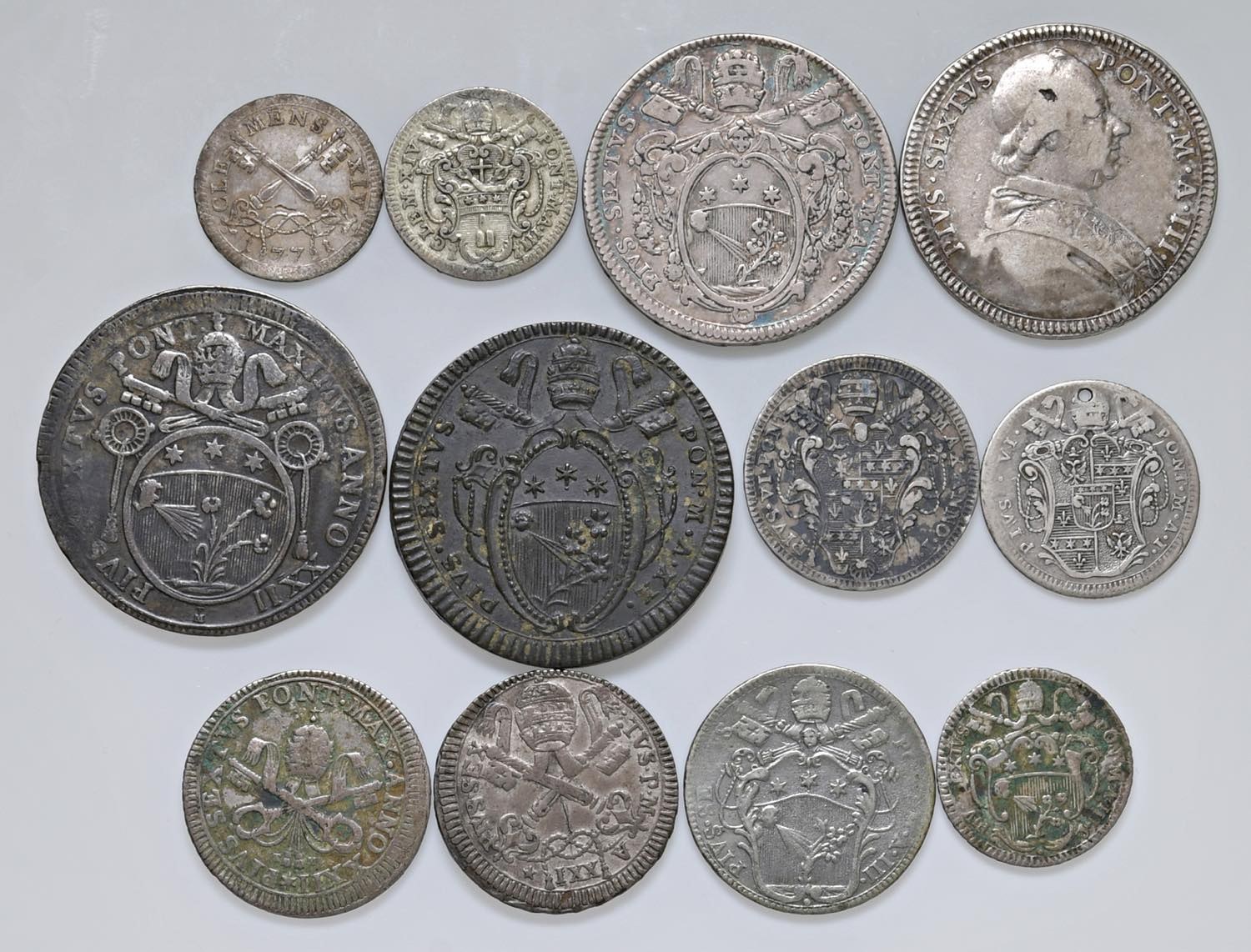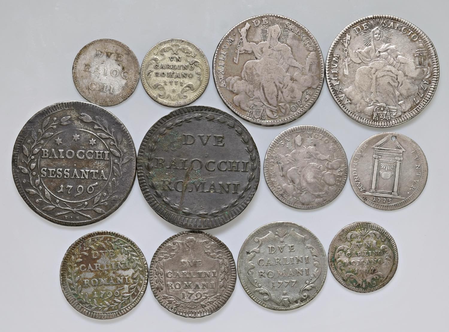 Resto di collezione composto da 12 monete: 1) Clemente XIV (1769-1774) 2 Baiocchi 1771 - Munt. 11 MI (g 1,56) RR; 2) Clemente XIV (1769-1774) Carlino 1771 - Munt. 9 MI (g 2,69) R; 3) Pio VI (1775-1799) Mezzo Scudo 1780 An. V - Munt. 25b AG (g 12,99); 4) Pio VI (1775-1799) Mezzo Scudo 1777 An. III - Munt. manca; MIR 2766/2 AG (g 13,01) NC; 5) Pio VI (1775-1799) Giulio 1775 An. I - Munt. 49 AG (g 2,55) RR Forata; 6) Pio VI (1775-1799) Quinto di Scudo 1775 An. I - Munt. 35 AG (g 5,18) RRR; 7) Pio VI (1775-1799) 2 Baiocchi An. XX - Munt. 112I CU (g 20,01) Segno al R/; 8) Pio VI (1775-1799) 60 Baiocchi 1796 An. XXII - Munt. 62 MI (g 22,65); 9) Pio VI (1775-1799) 2 Carlini 1796 An. XXII - Munt. 83 MI (g 5,45) NC; 10) Pio VI (1775-1799) 2 Carlini 1795 An. XXI - Munt. 80b MI (g 5,45); 11) Pio VI (1775-1799) 2 Carlini 1777 An. III - Munt. 73 MI (g 5,41); 12) Pio VI (1775-1799) Carlino 1777 An. III - Munt. 86 MI (g 2,69) Non si accettano resi.