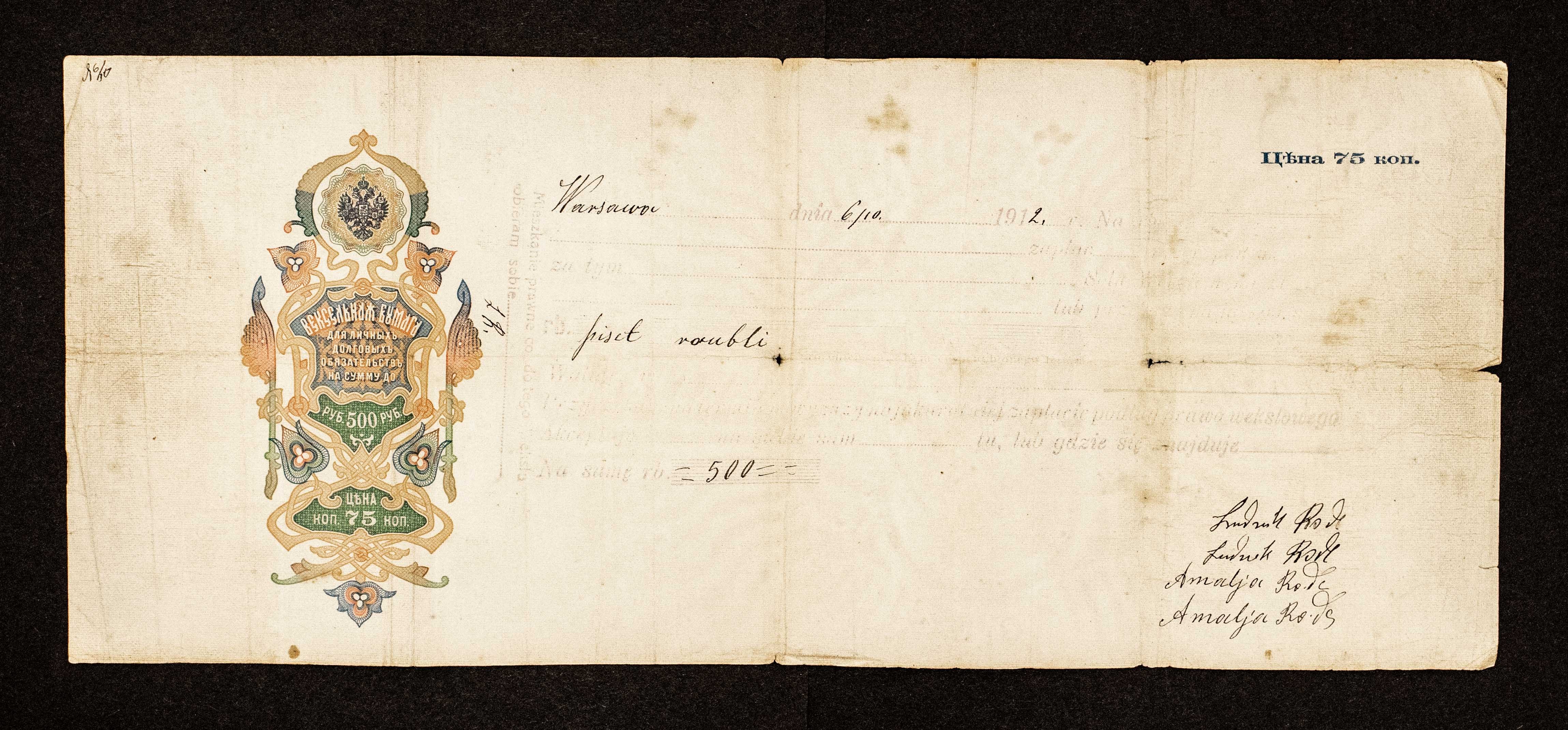 Rosyjski papier dłużny, wystawiony w Warszawie. Weksel na 500 rubli. Papier łamany z prześwitem. Bardzo ładny i ciekawy znak wodny.