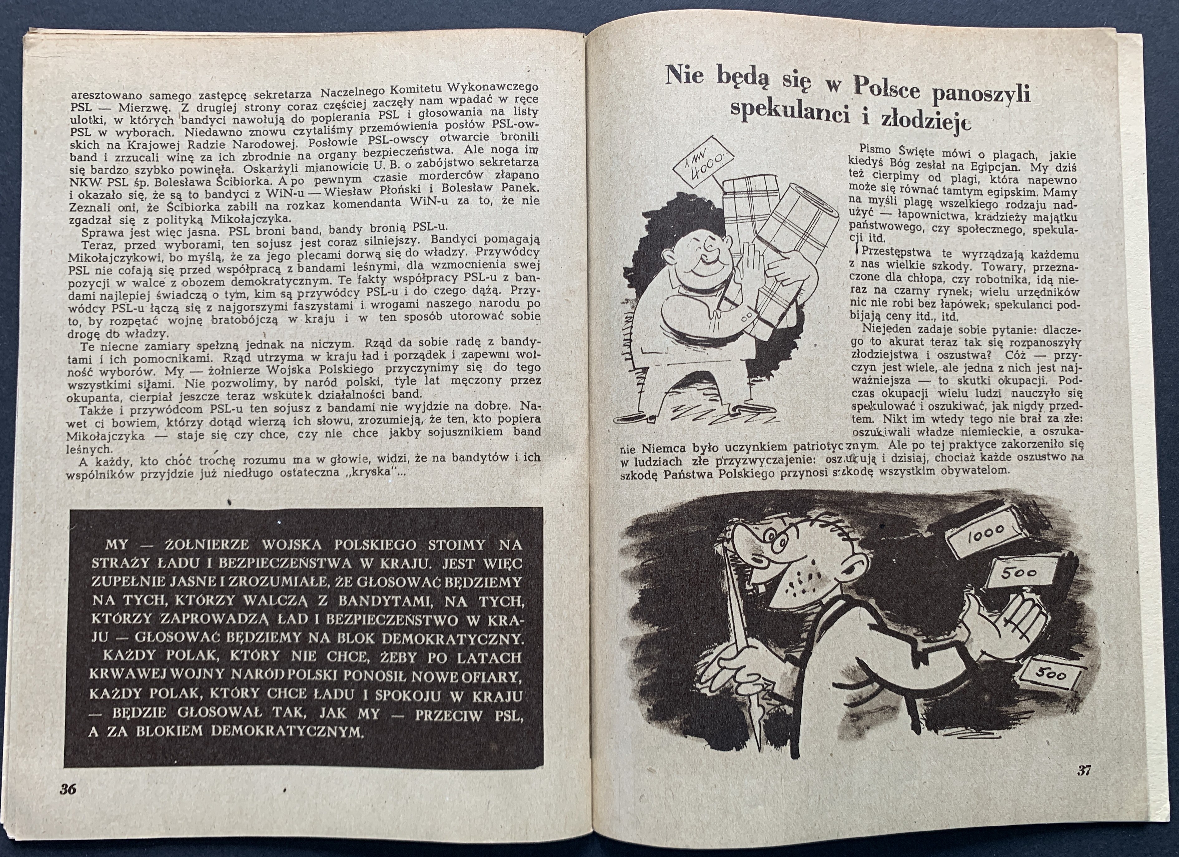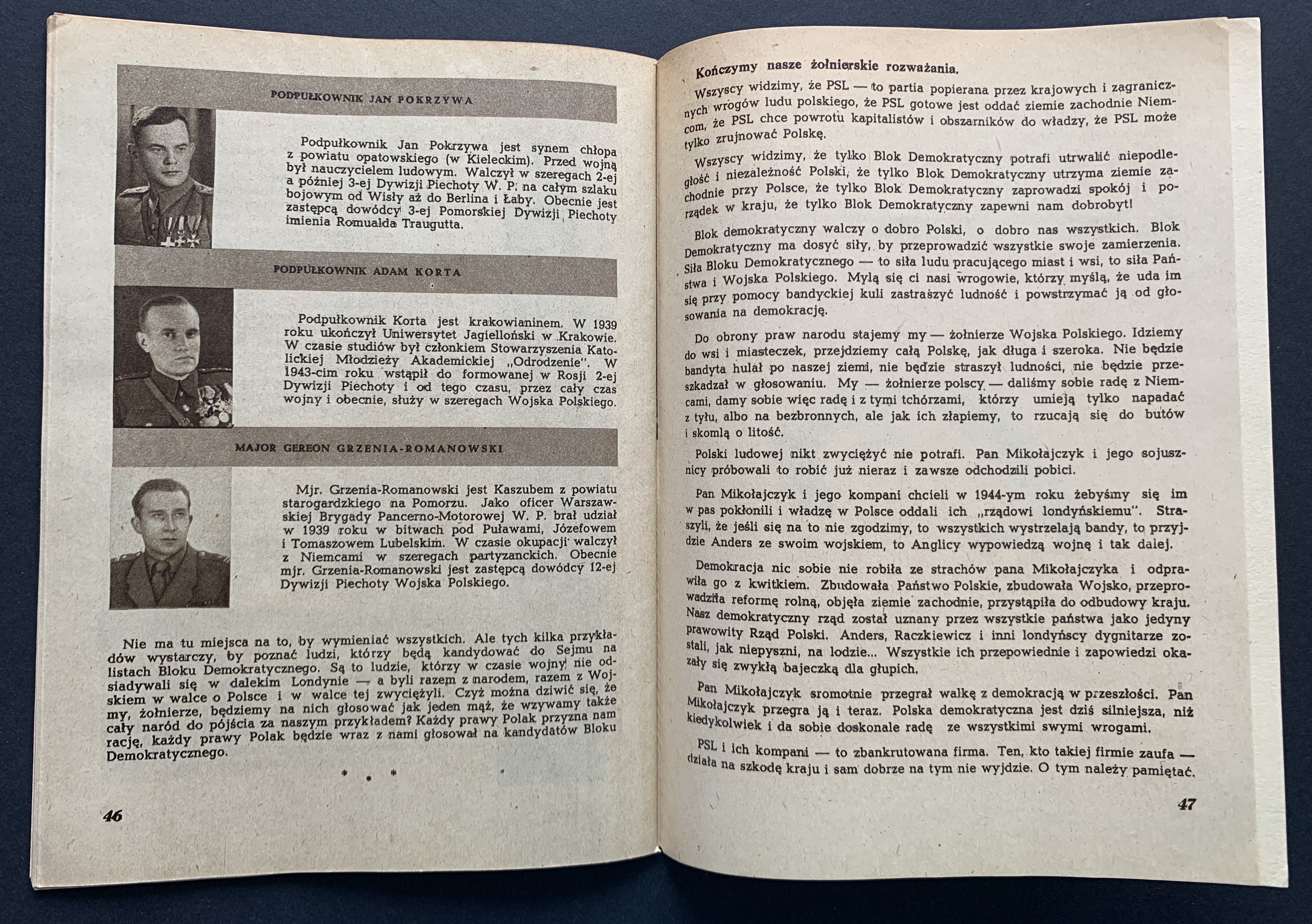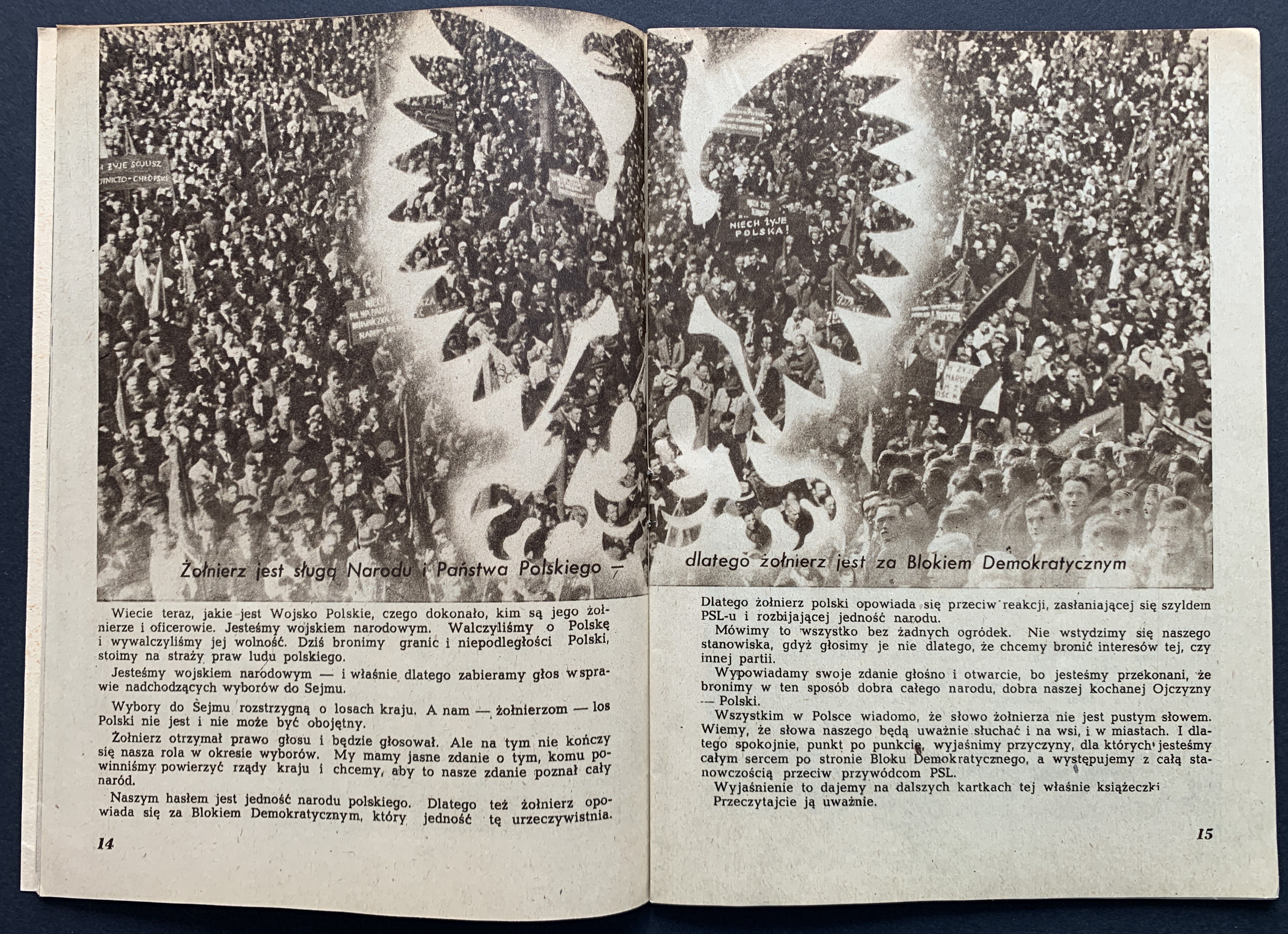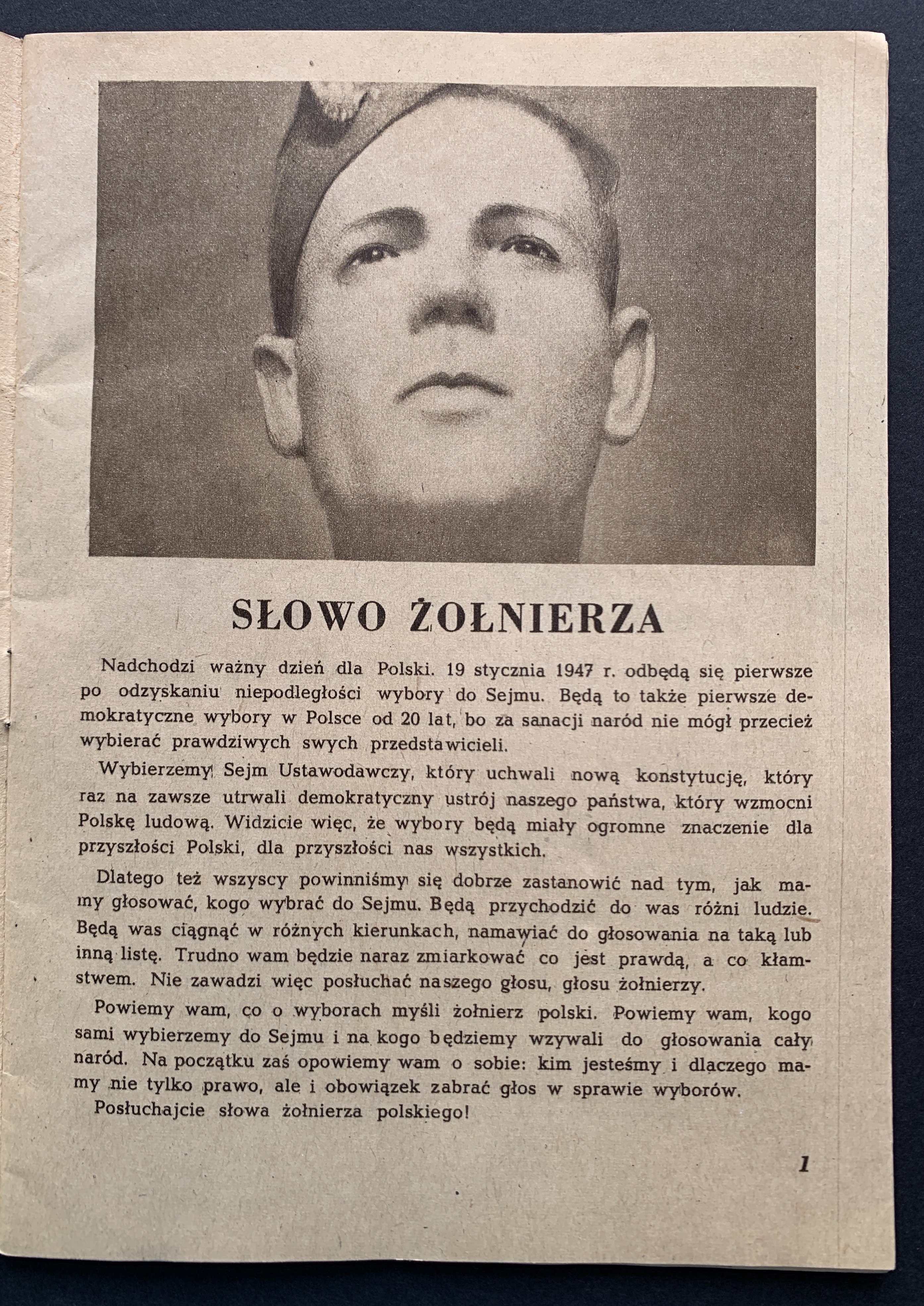 Broszura propagandowa skierowana do żołnierzy wydana przed wyborami 19 stycznia 1947 roku - pierwszymi po zakończeniu II WŚ wyborami do Sejmu. Zostały one przeprowadzone po umocnieniu się władzy komunistycznej i bezpieki, a kampania wyborcza przebiegała w atmosferze terroru. Wyniki głosowania zostały sfałszowane, co miało na celu sformalizowanie władzy sowieckiej w Polsce...