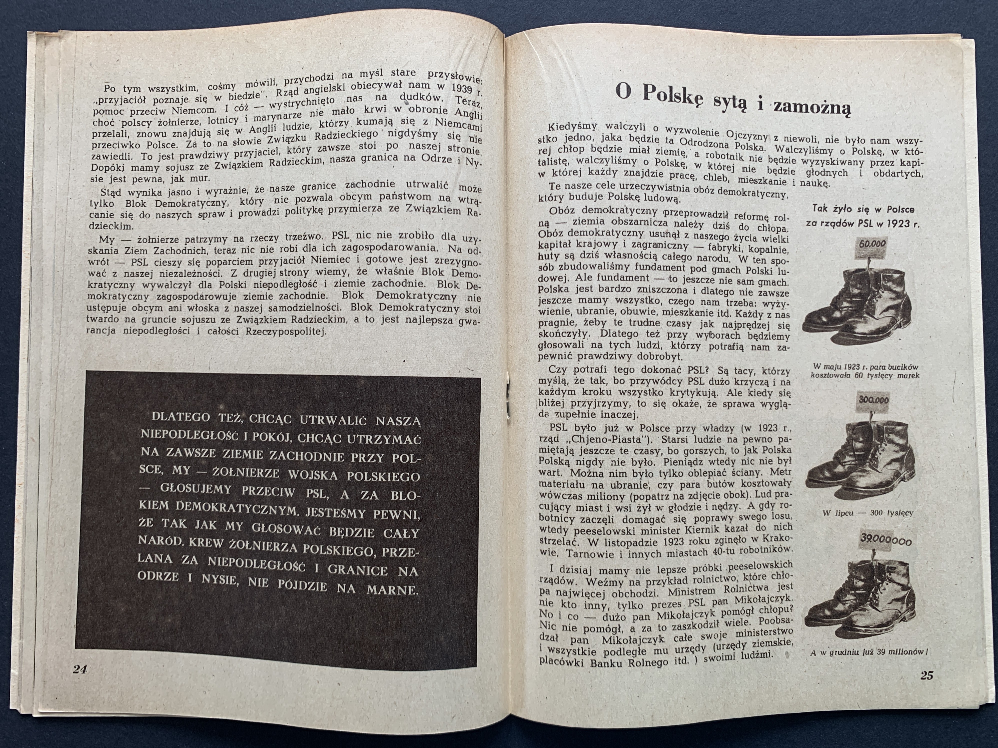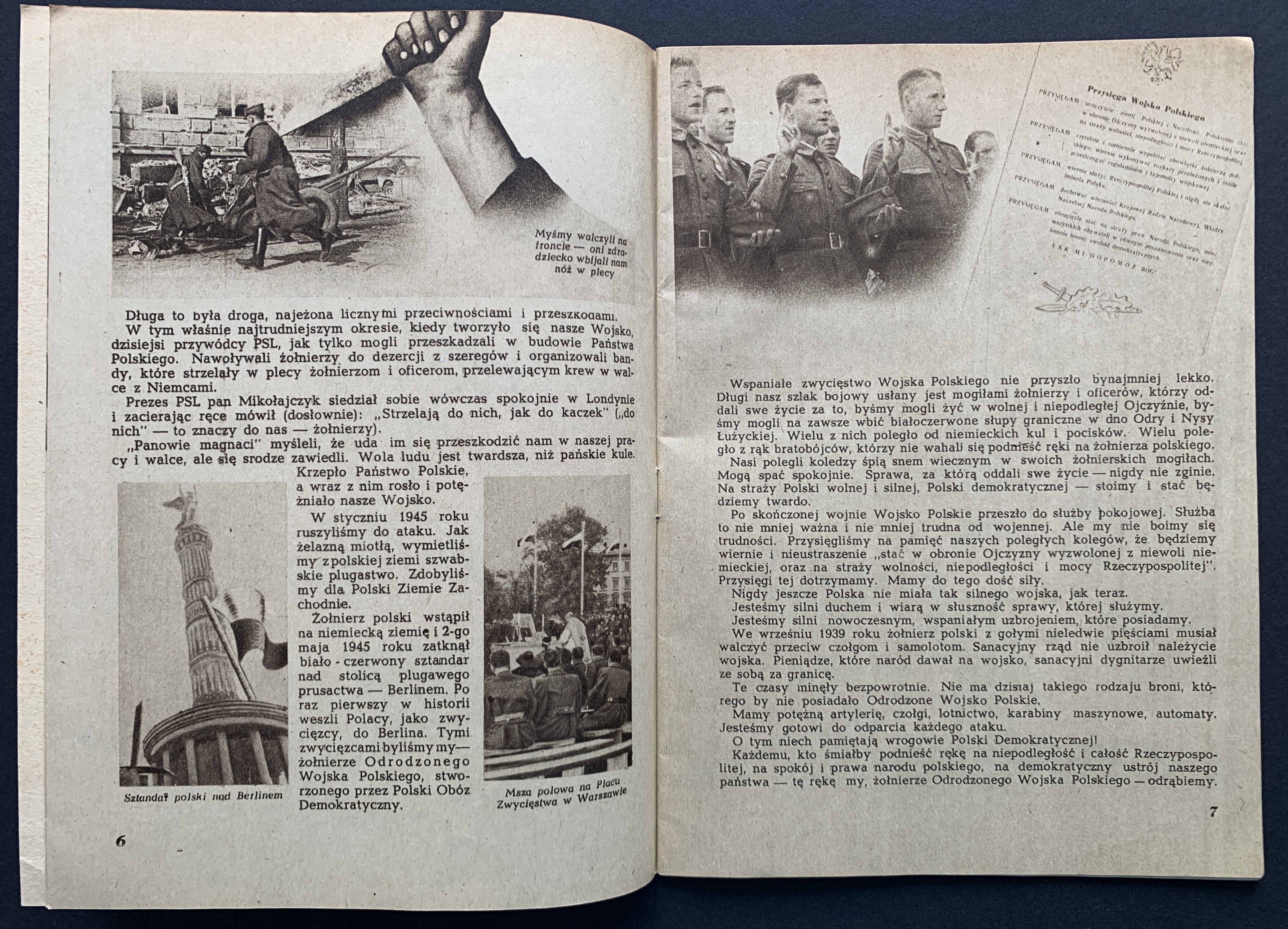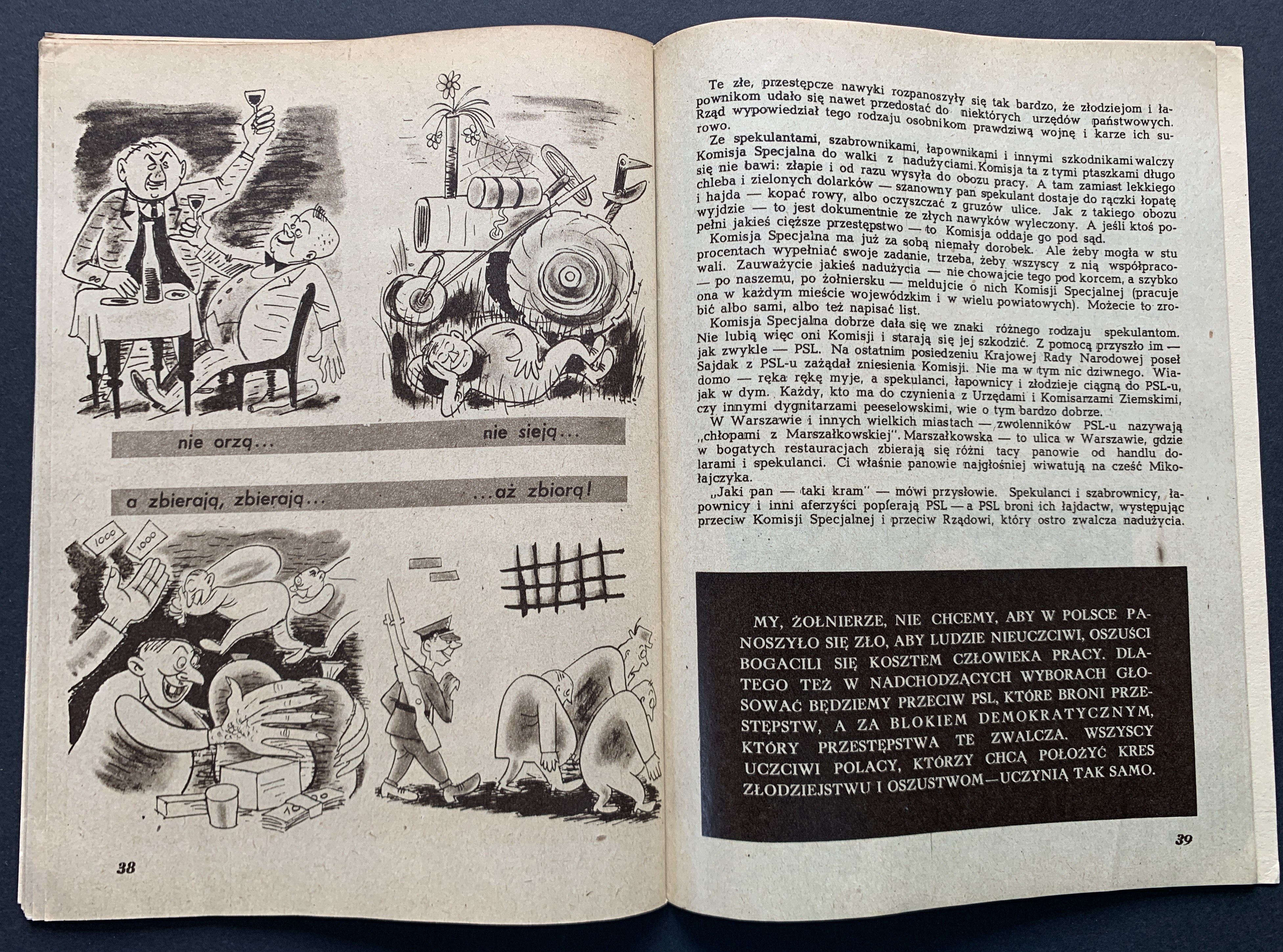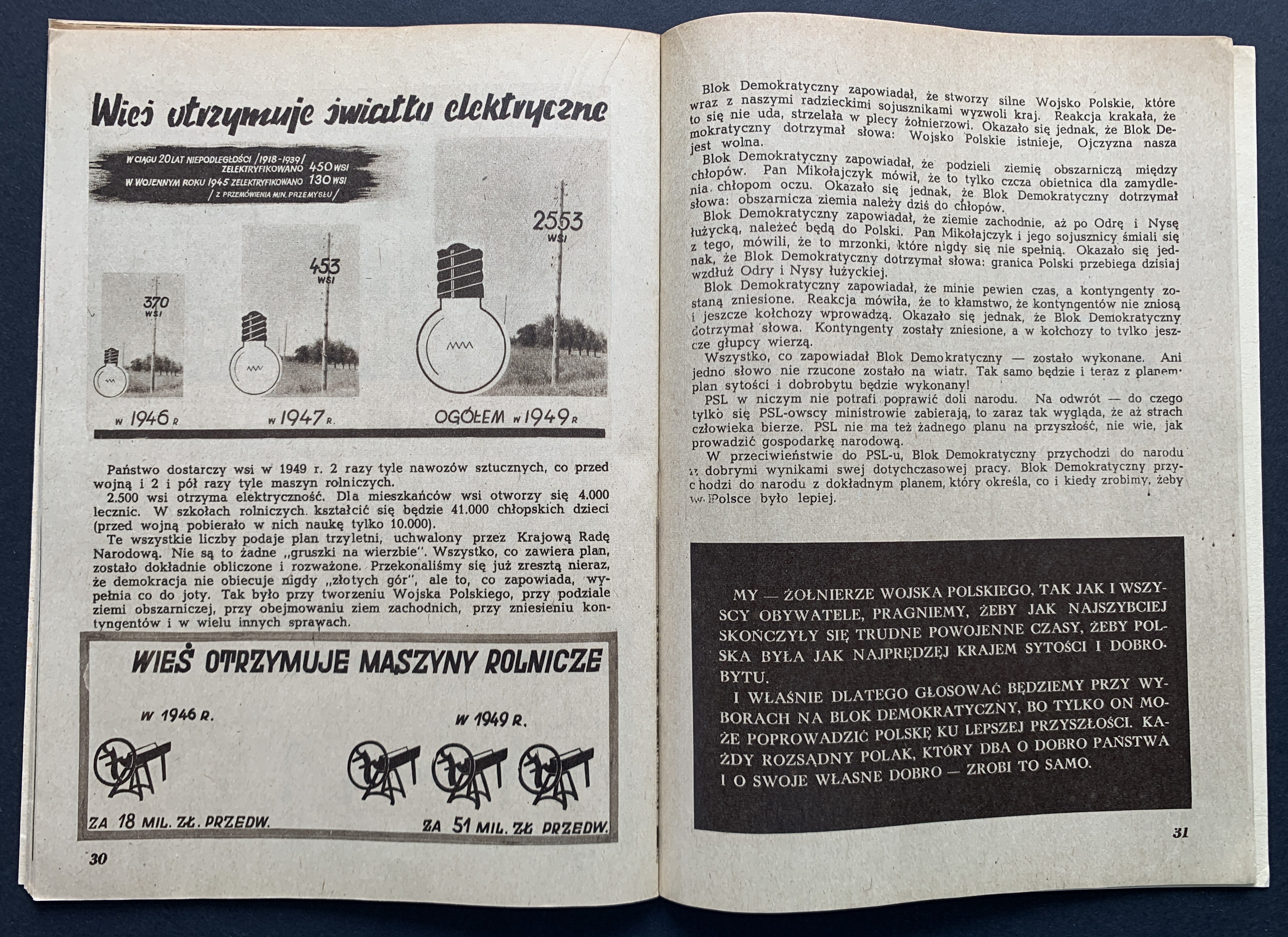 Broszura propagandowa skierowana do żołnierzy wydana przed wyborami 19 stycznia 1947 roku - pierwszymi po zakończeniu II WŚ wyborami do Sejmu. Zostały one przeprowadzone po umocnieniu się władzy komunistycznej i bezpieki, a kampania wyborcza przebiegała w atmosferze terroru. Wyniki głosowania zostały sfałszowane, co miało na celu sformalizowanie władzy sowieckiej w Polsce...