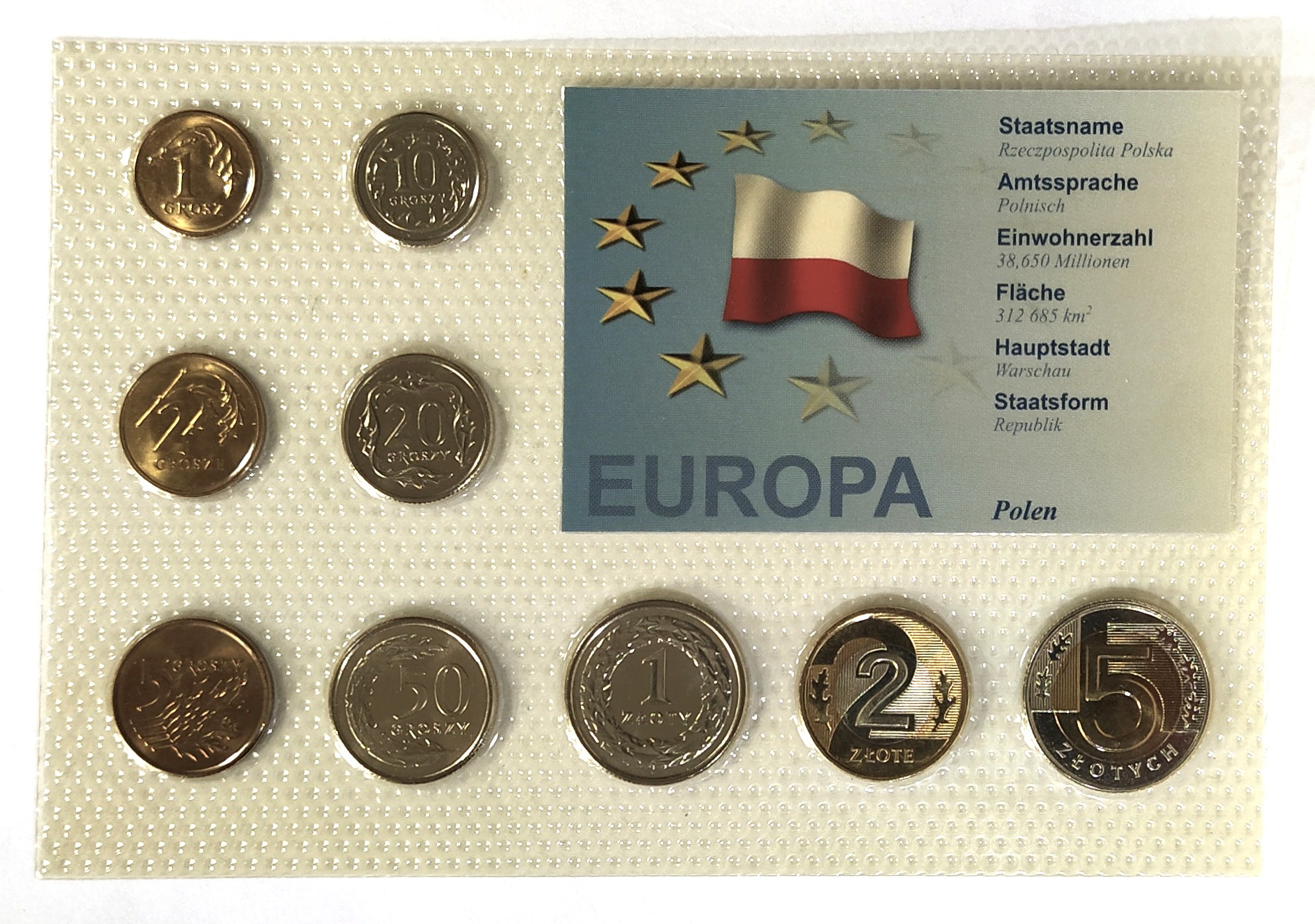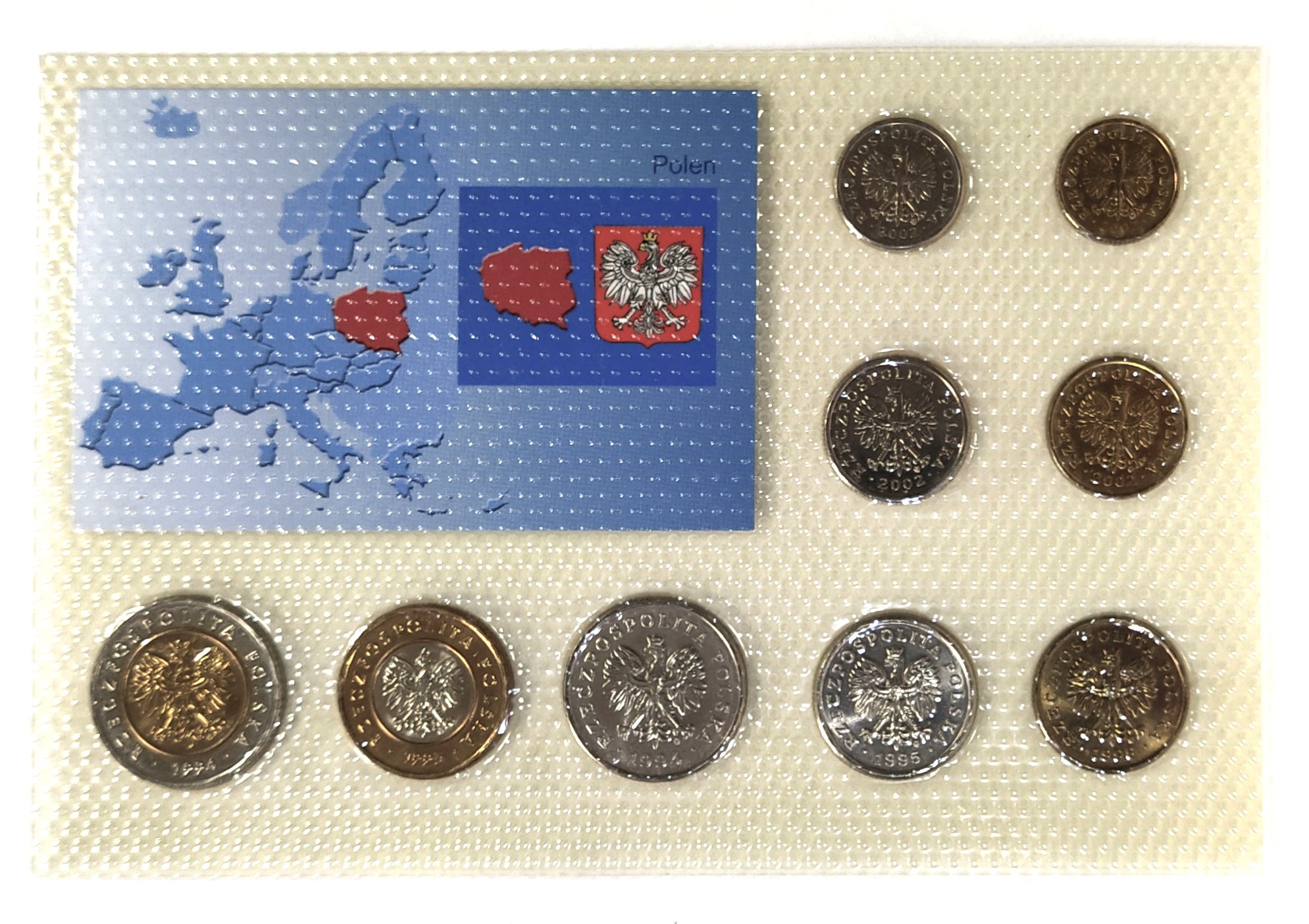 W zestawie: 1 grosz 2002, 2 grosze 2002, 5 groszy 1998, 10 groszy 2002, 20 groszy 2002, 50 groszy 1995, 1 złoty 1994, 2 złote 1995, 5 złotych 1994.