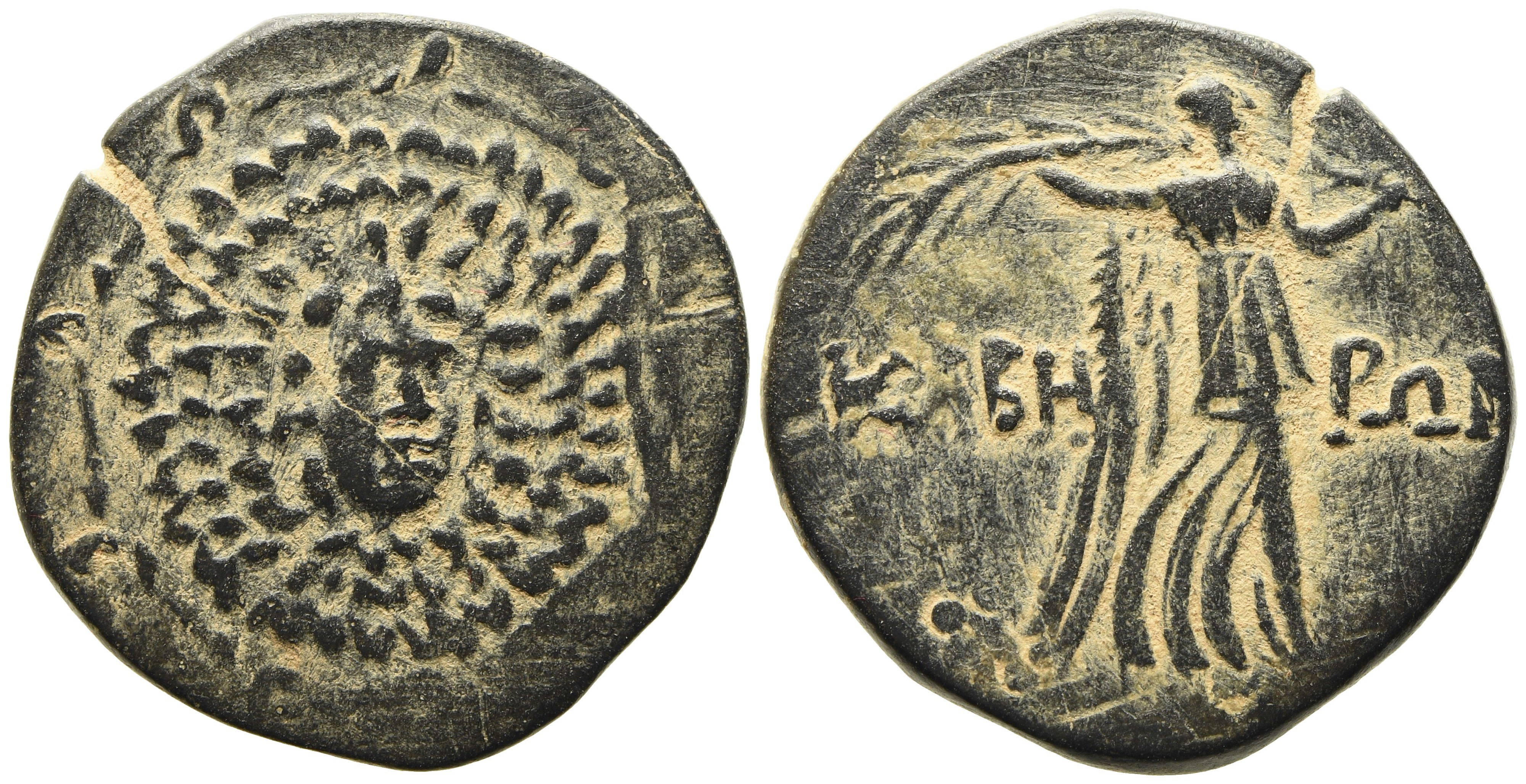 Three-quarter facing head of gorgoneion, head turned slightly r., on an aegis; Rv. ΚΑΒΗ-ΡΩΝ, Nike walking r., holding palm. SNG BM Black Sea 1243. Appealing sandy patina. Good very fine.