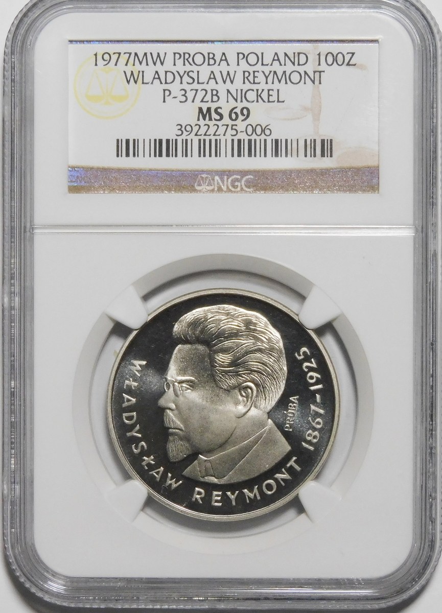 PRÓBA NIKIEL 100 złotych 1977 Władysław Reymont - głowa w lewo