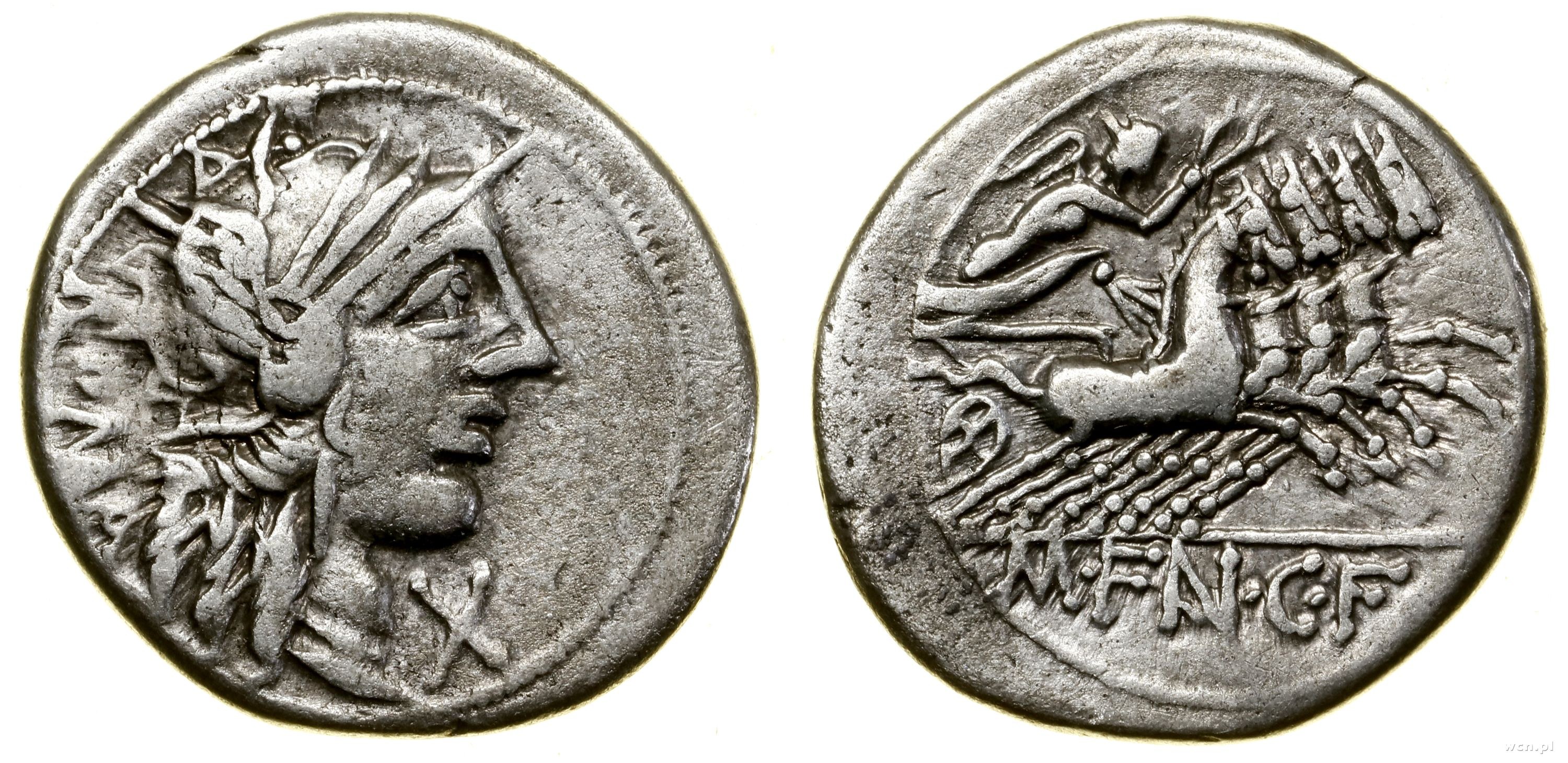 Aw: Głowa Romy w hełmie w prawo, za głową ROMA, przed nią X, Rw: Jupiter w kwadrydze w prawo, trzymający berło, lejce i piorun, w odcinku M F(AN) C F