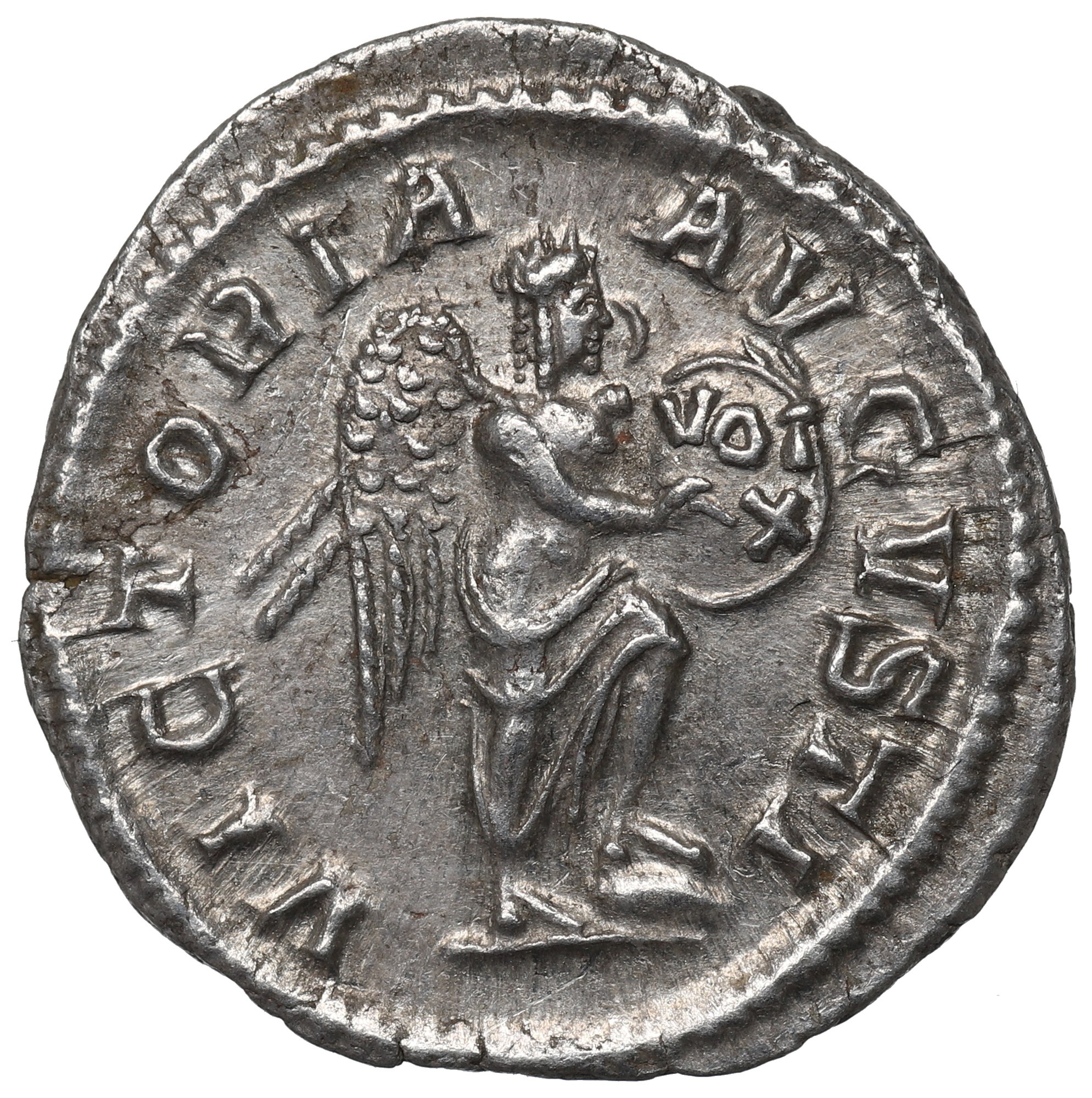 Rewers: Wiktoria stojąca w prawo, trzyma medalion z napisem VOT X, w otoku legenda: