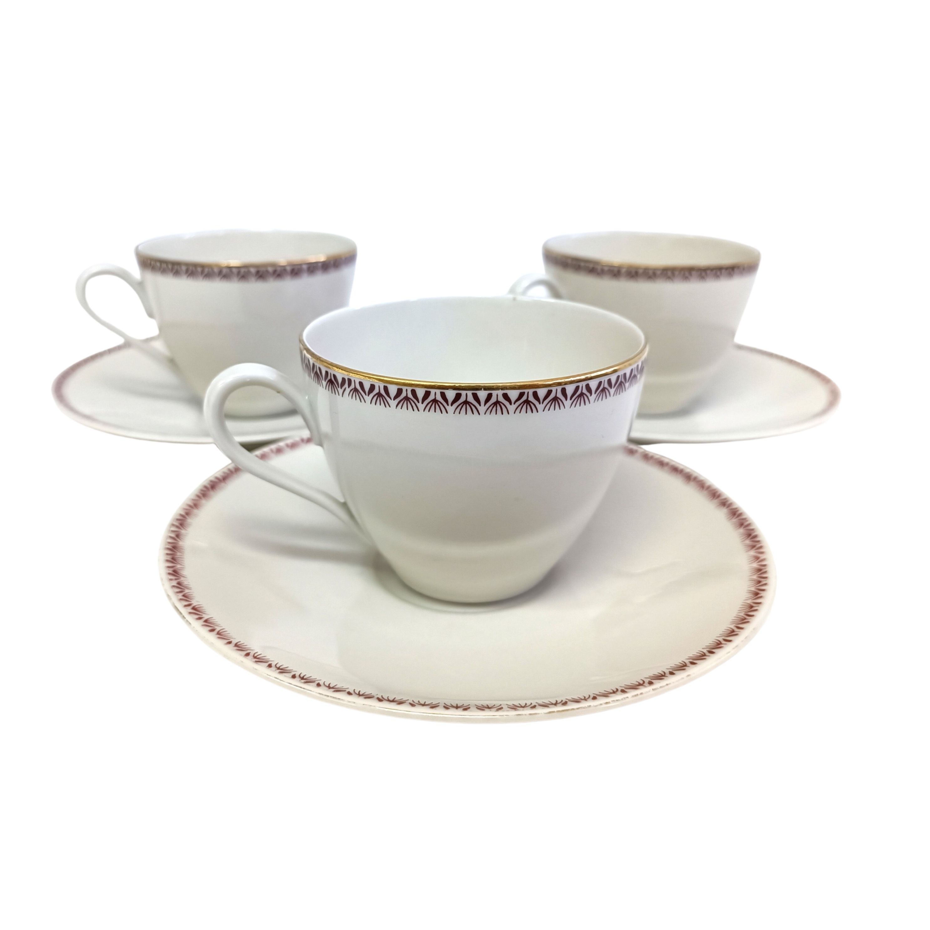 Zestaw porcelanowych filiżanek ze spodkami marki Bavaria Edelporzellan. Biała, niemiecka porcelana, zdobiona regularnym, brązowym wzorem i złotymi obwódkami. Zestaw składa się z 6 elementów: 3 filiżanki i 3 spodki.