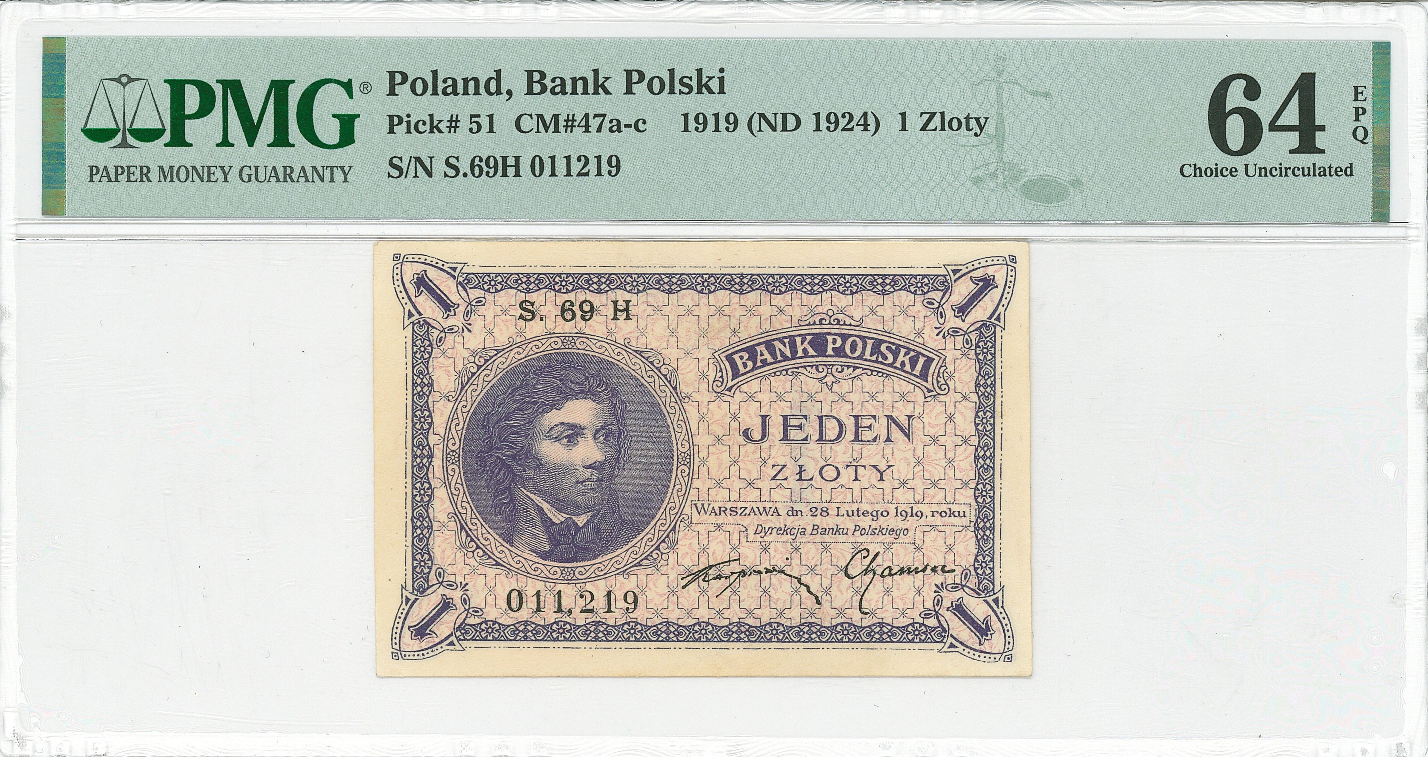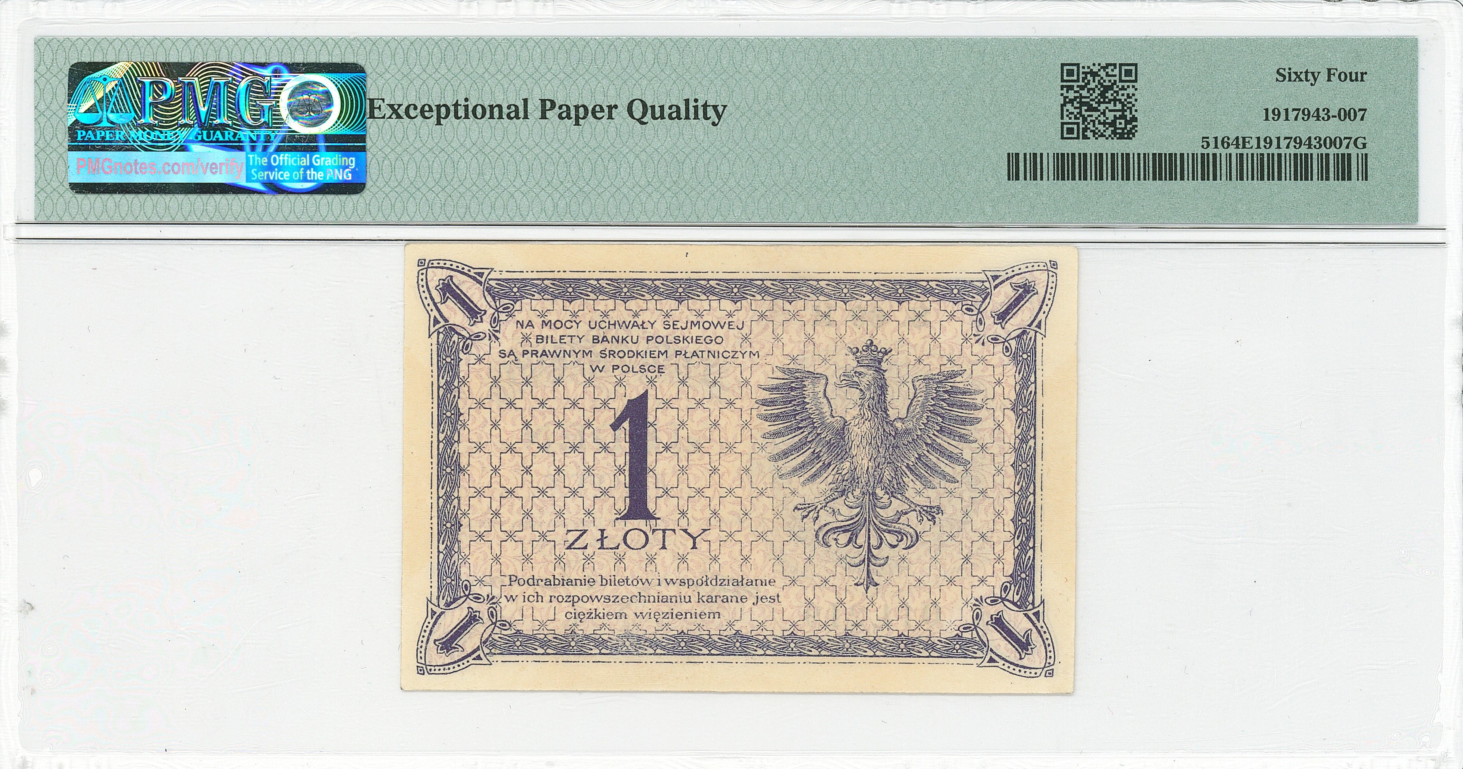 Banknot w doskonałej kondycji potwierdzonej ekstremalnie wysoką jak na ten typ oceną w PMG 64EPQ.