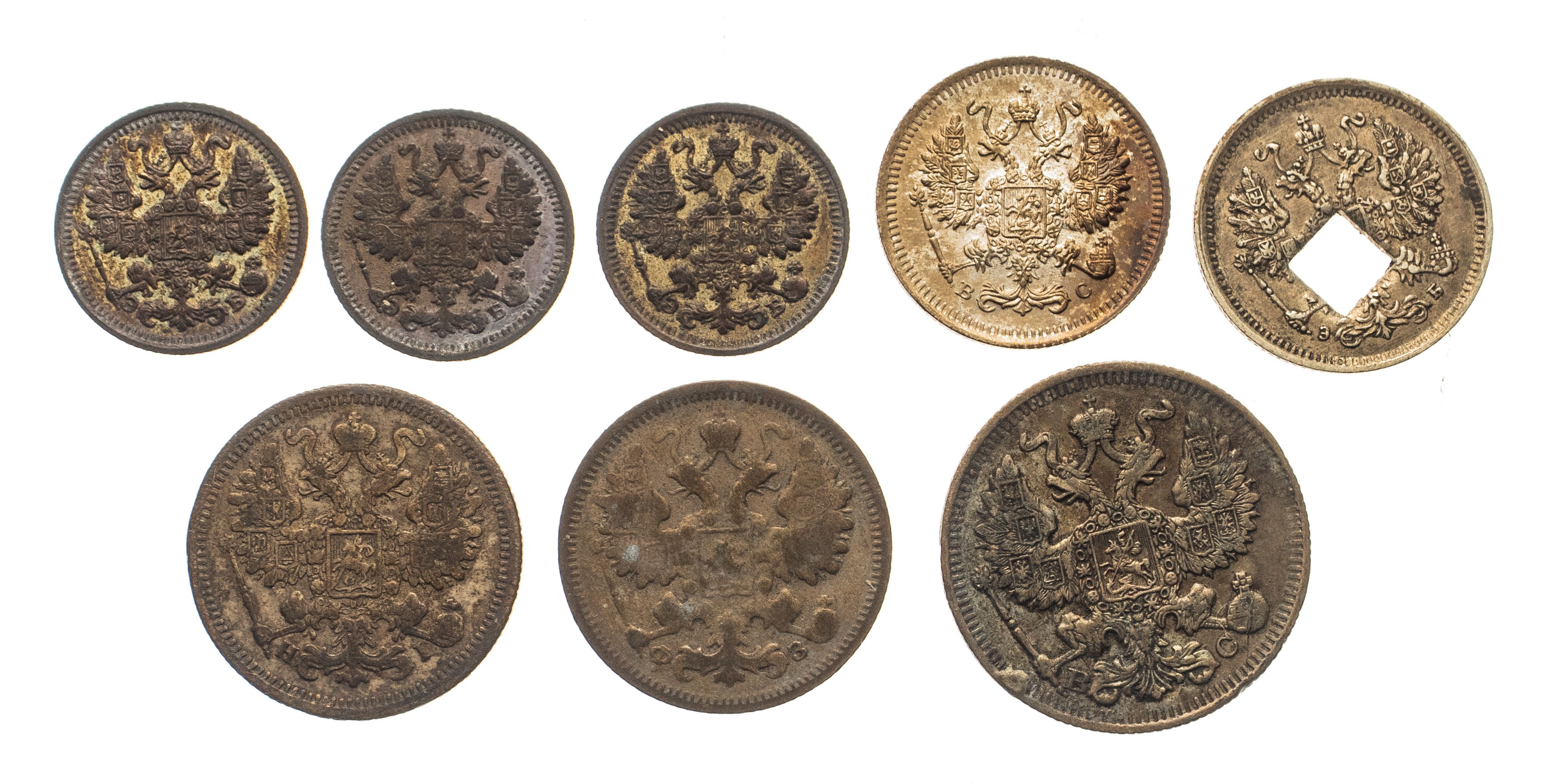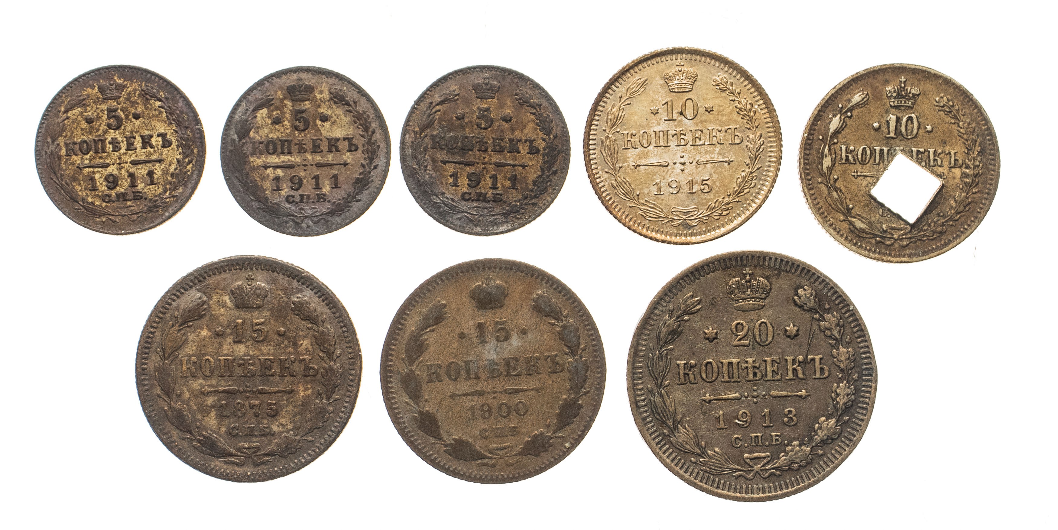 Rosja, zestaw srebrnych monet 5-20 kopiejek 1875-1915, 8 sztuk