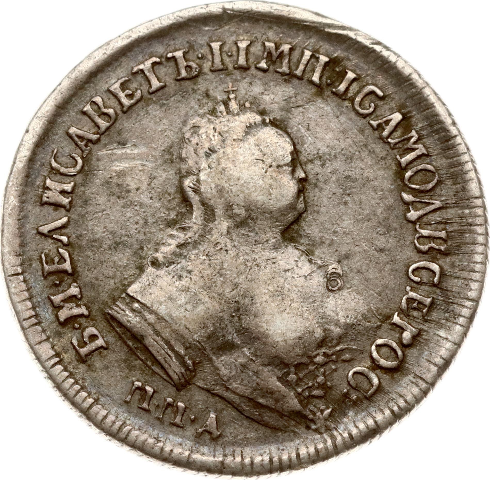 Russia. Elizabeth (1741-1762). Polupoltinnik 1747 ММД-EI, Moscow. Silver 6.15 g. Bitkin 159. Old patina.