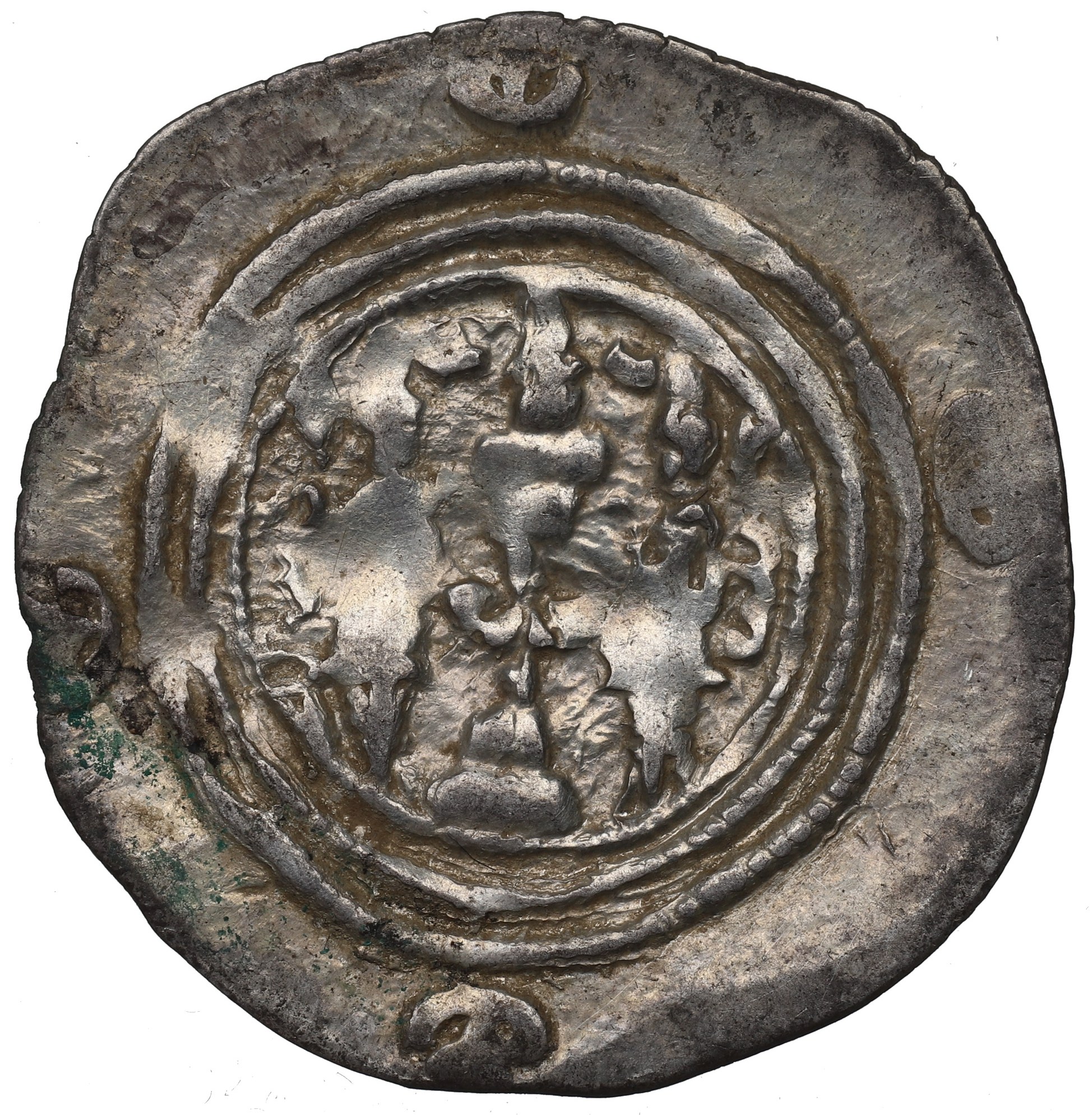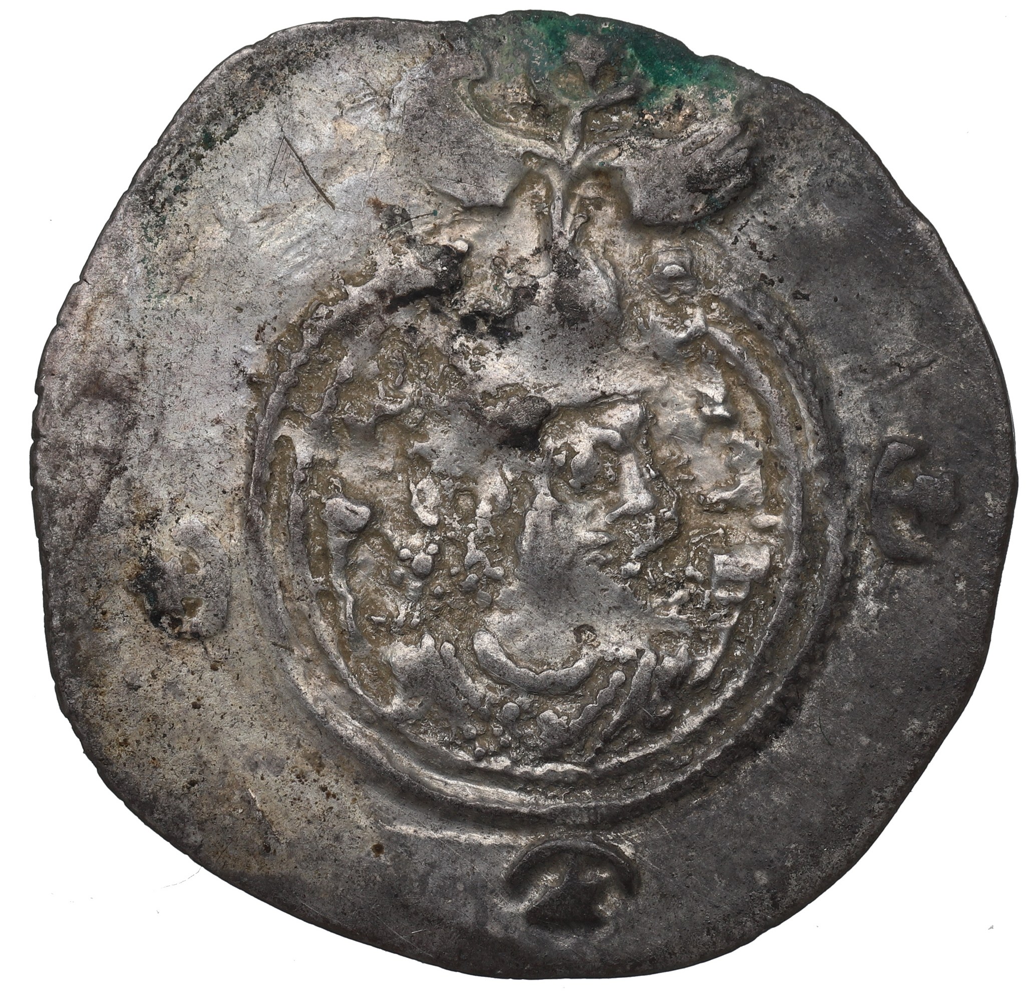 Awers: w podwójnym otoku perełkowym popiersie władcy w prawo, w polach legenda w Pahlavi, poza otokiem cztery gwiazdy na półksiężycach;