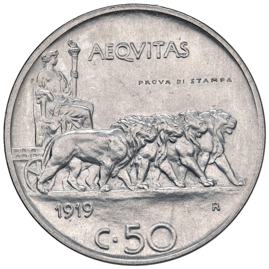 Vittorio Emanuele III (1900-1946) 50 Centesimi 1919 PROVA DI STAMPA - Nomisma P49 CU (g 6) RR Minimo segnetto al D/ nel campo.
