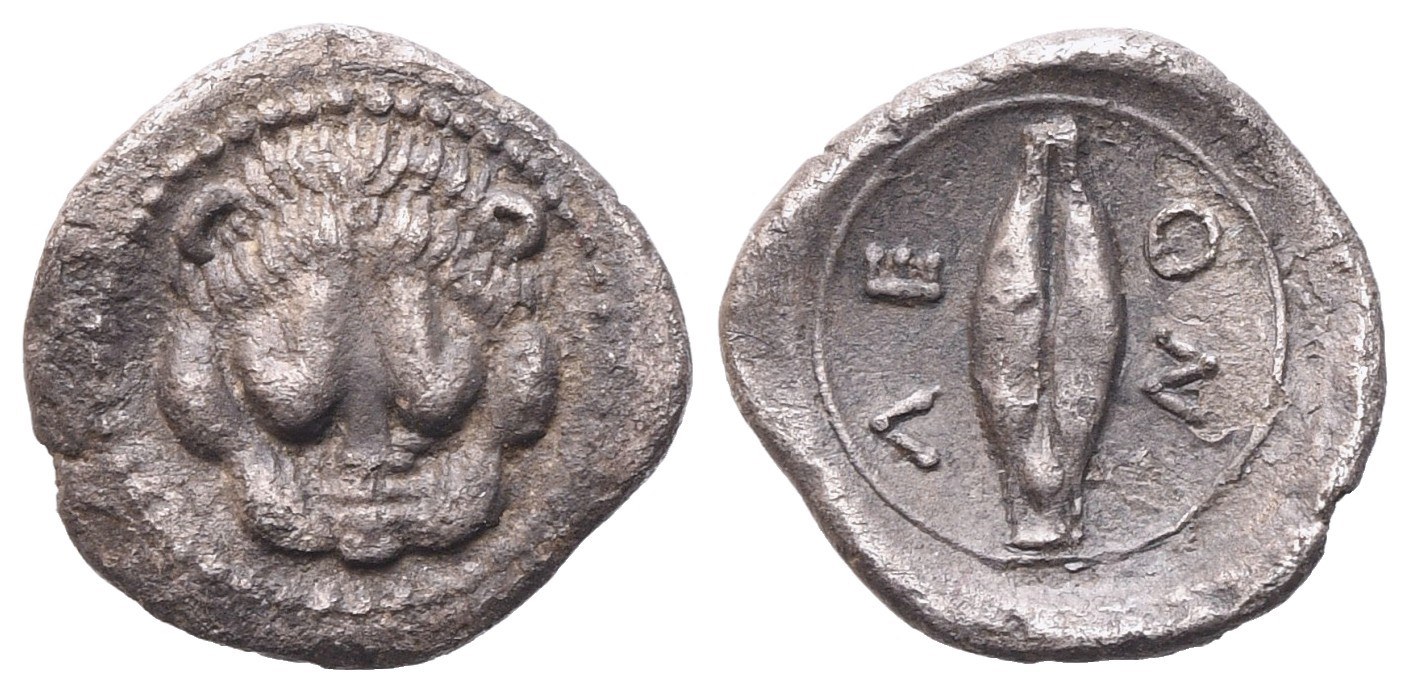 Facing lion's head; Rv. ΛE-ΟΝ, Grain of barley. BMC 2.19; Hirmer-Kraay 828; SNG ANS 213. Extremely fine.