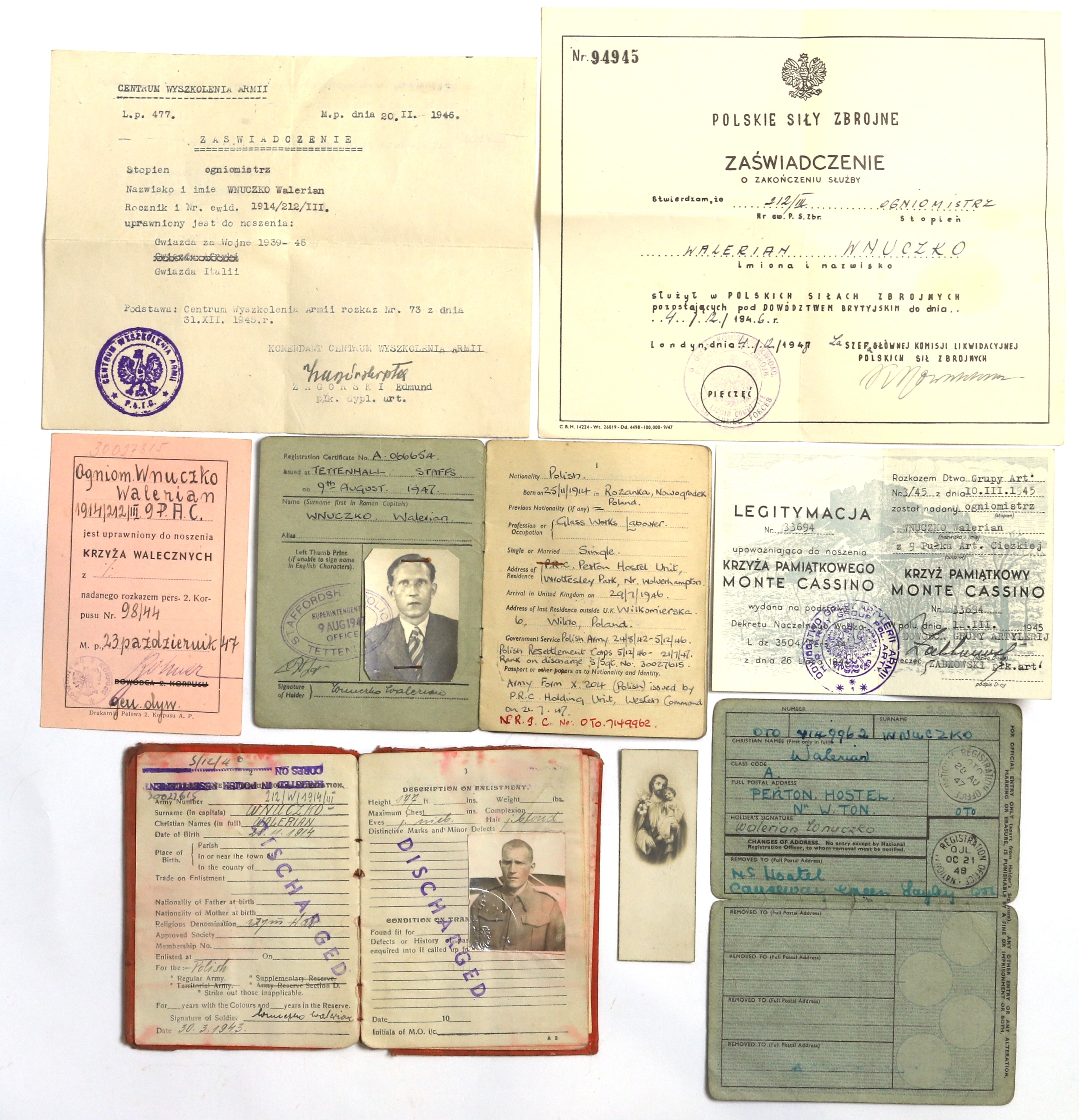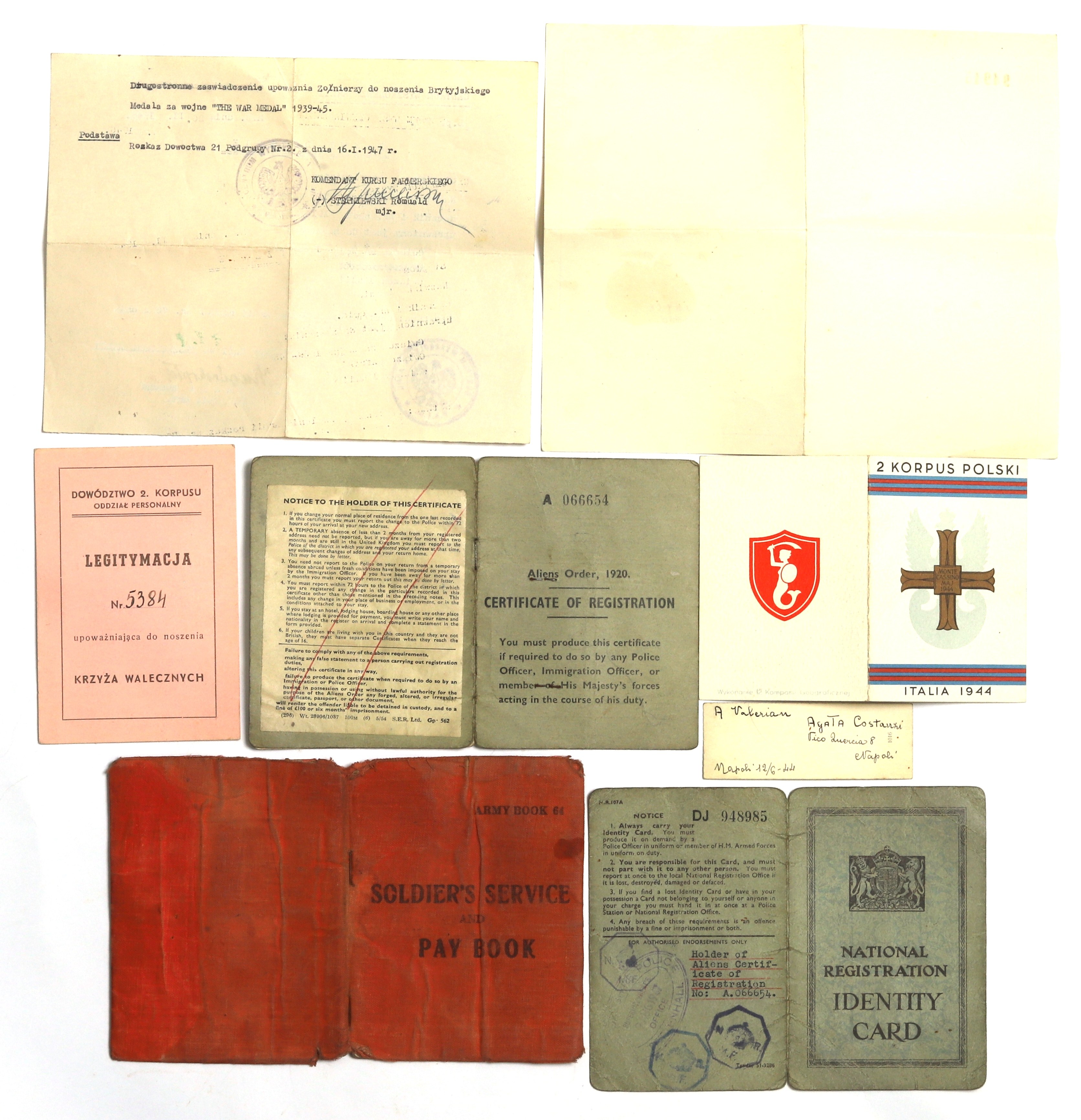 W skład zestawu wchodzą m.in. legitymacja Krzyża Walecznych i legitymacja Krzyża Monte Cassino.