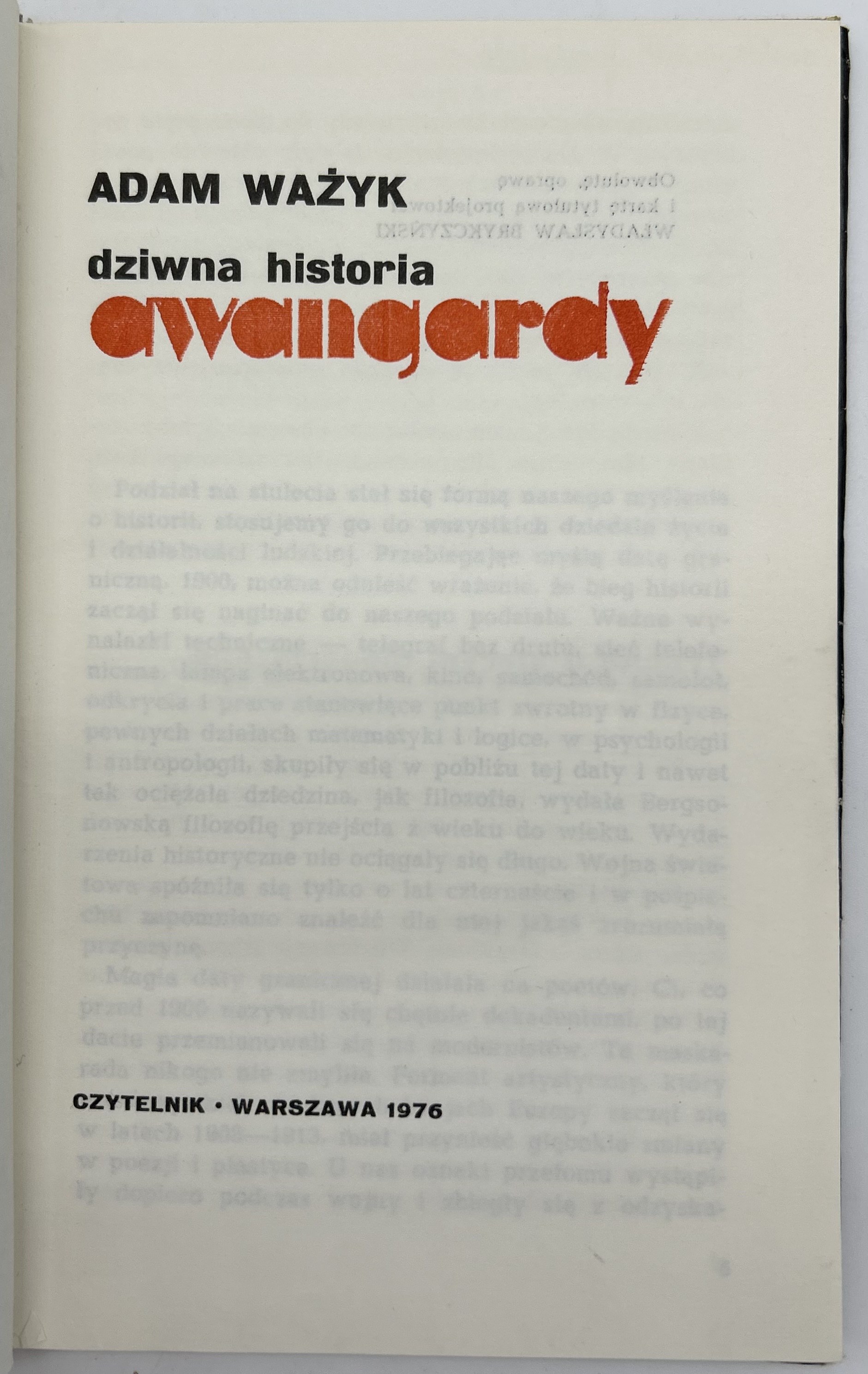 Ważyk Adam/ Dziwna historia awangardy/ Warszawa 1976/ Czytelnik/ wydanie pierwsze/ twarda płócienna oprawa wydawnicza z obwolutą/ s.170/ stan bardzo dobry-, przetarcia i zadarcia obwoluty