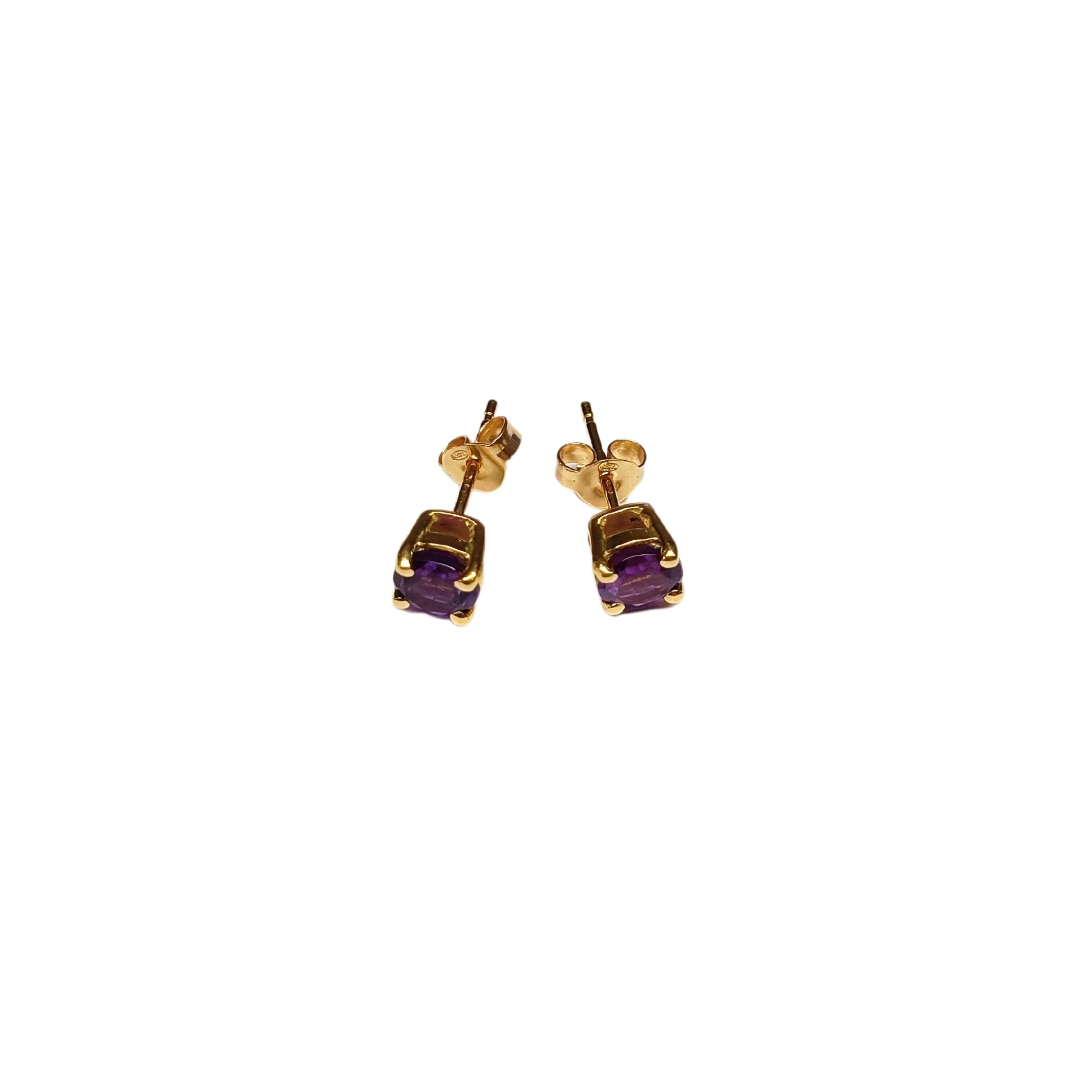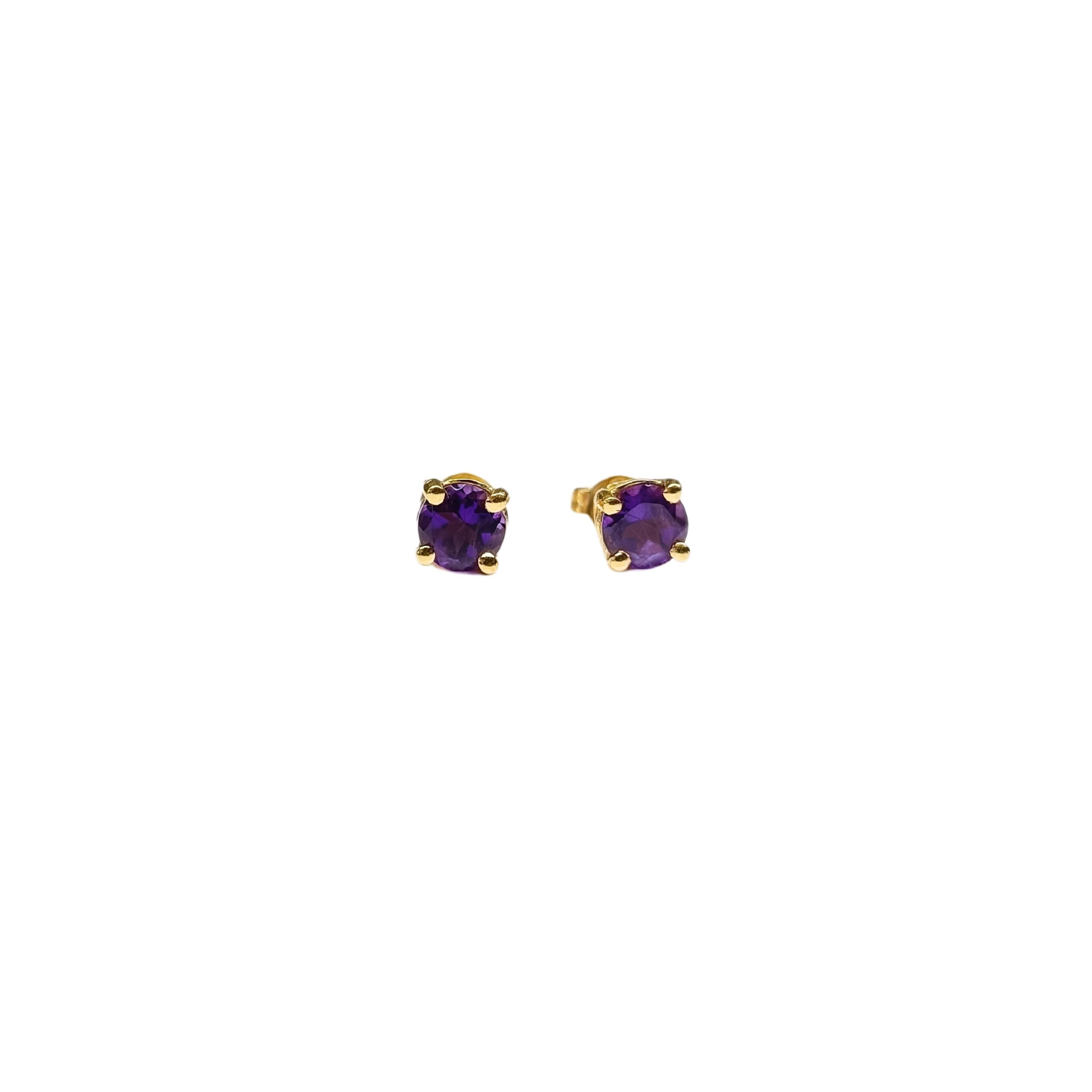 Para klasycznych złotych kolczyków z fioletowymi kamieniami (ametysty?).