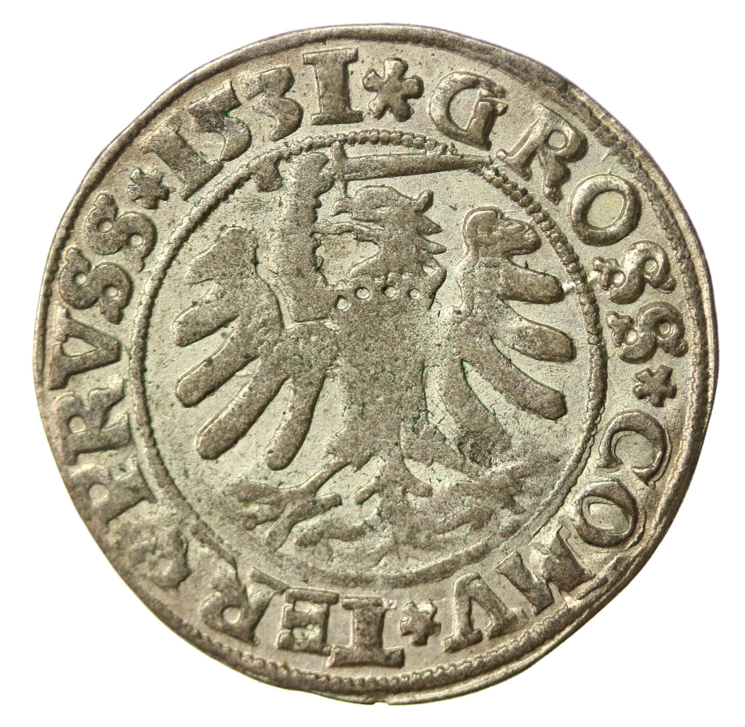 Zygmunt I Stary, Grosz 1531, Toruń. Prus/Pruss. Stan zachowania 2. Bardzo dobrze wybita i czytelna moneta z połyskiem. Literatura: Kopicki 3086