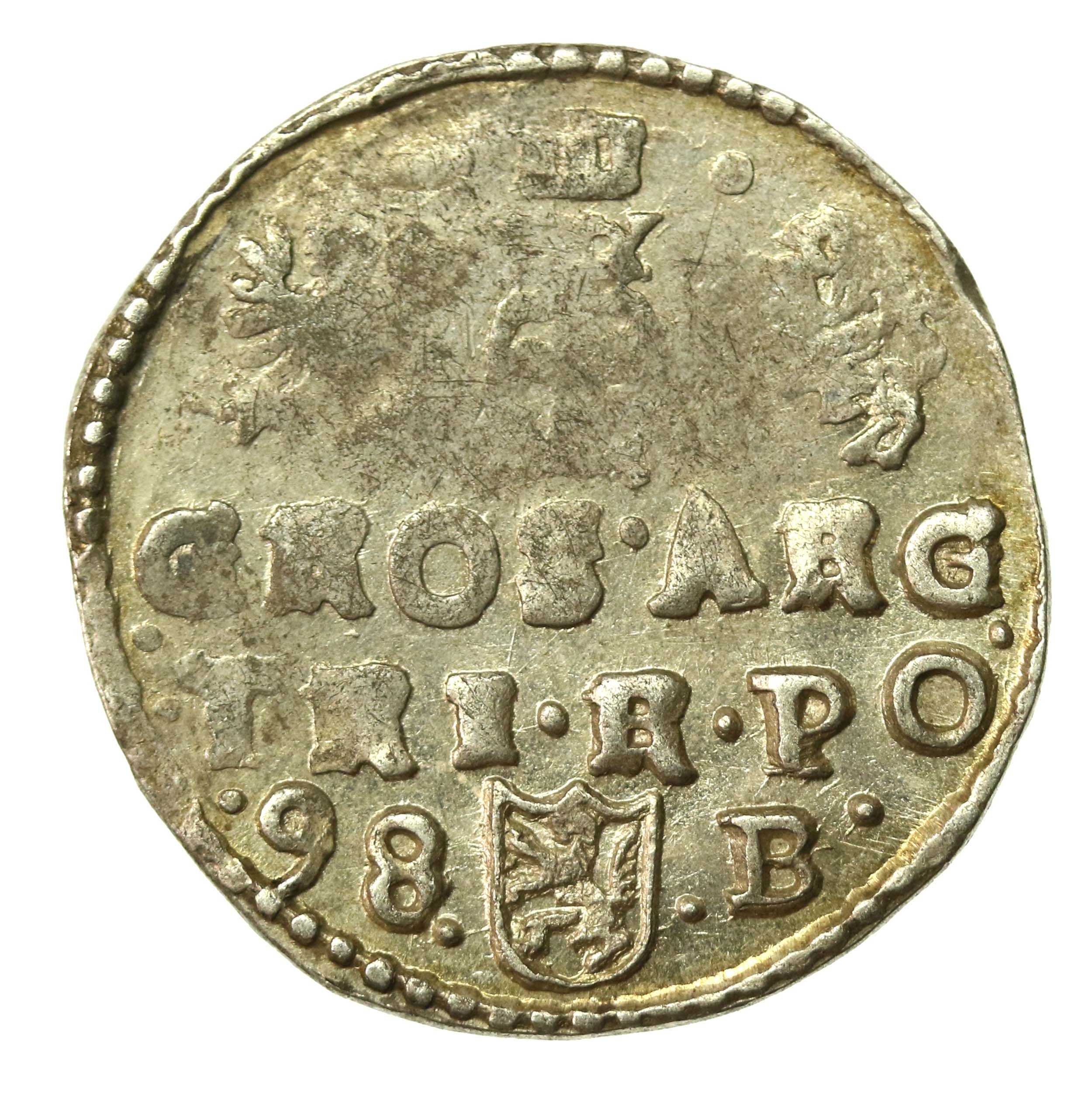 Zygmunt III Waza, Trojak 1598, Bydgoszcz - B z prawej - hybryda. Stan zachowania: 2. Niedobity, ale w pełni czytelny i jak na ten typ pięknie zachowany egzemplarz. Połysk i lustro mennicze Początki urokliwej patyny. Nieopisane u Igera zestawienie stempli. Literatura: Iger brak, Iger hybryda B.98.5.d/c,e