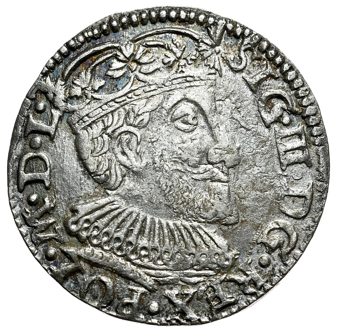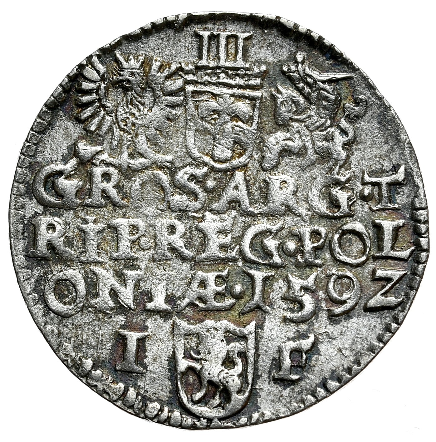 Rzadka odmiana z dużą głową króla i pełną datą 159Z na końcu legendy rewersu. Atrakcyjny, spatynowany egzemplarz.
