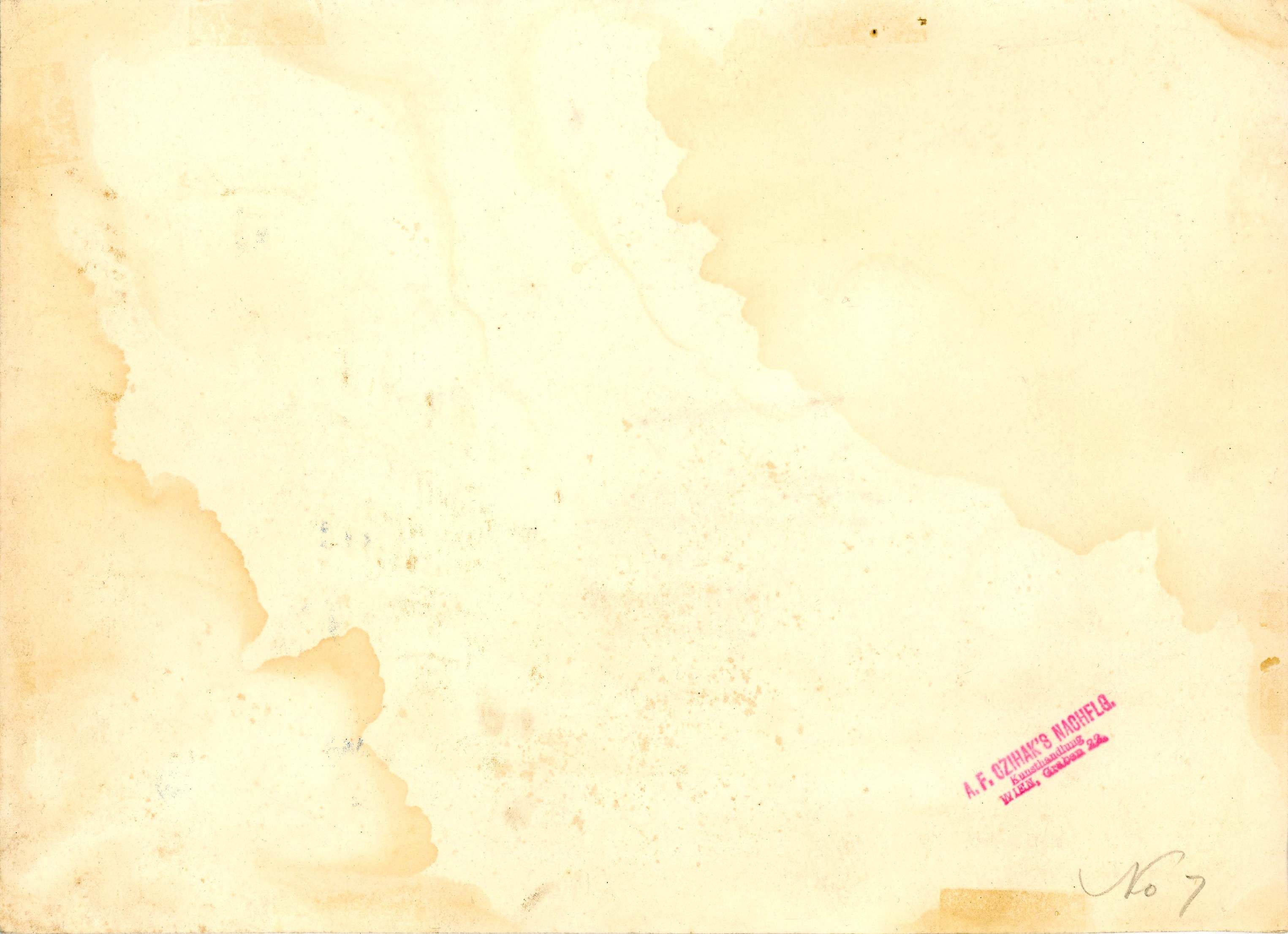 Druk ręcznie kolorowany, papier. Wym.: 260 x 188 mm. Minimalnie zagięty lewy dolny róg. Sygn. l. d. r. Na odwrocie niewielkie ślady zalania, pieczątka.