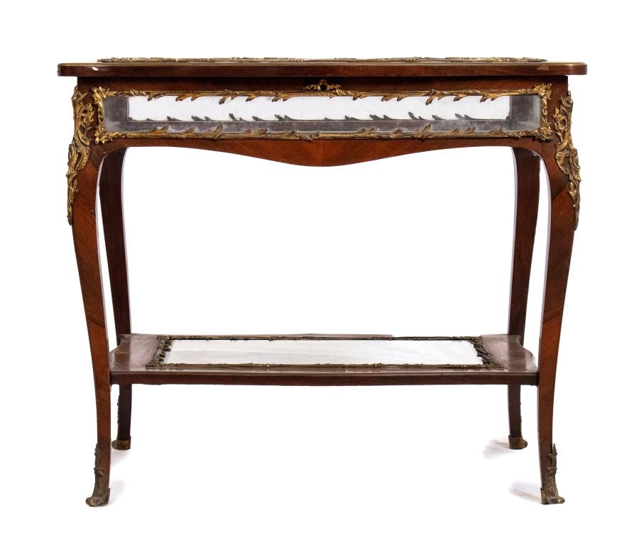 with gilt bronze applications and lower shelf with mirror. French Napoleon III mahogany display table Napoleon III