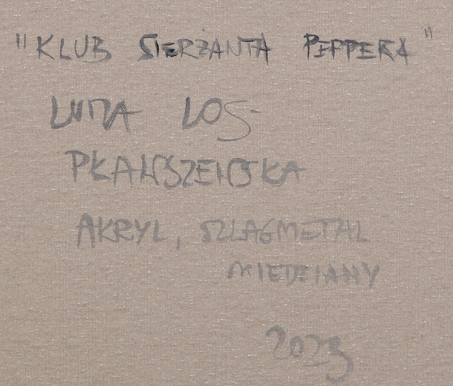 sygnowany, datowany i opisany na odwrociu: '"KLUB SIERŻANTA PEPPERA" | LUIZA LOS- | PŁAWSZEWSKA | AKRYL, SZLAGMETAL | MIEDZIANY | 2023'
