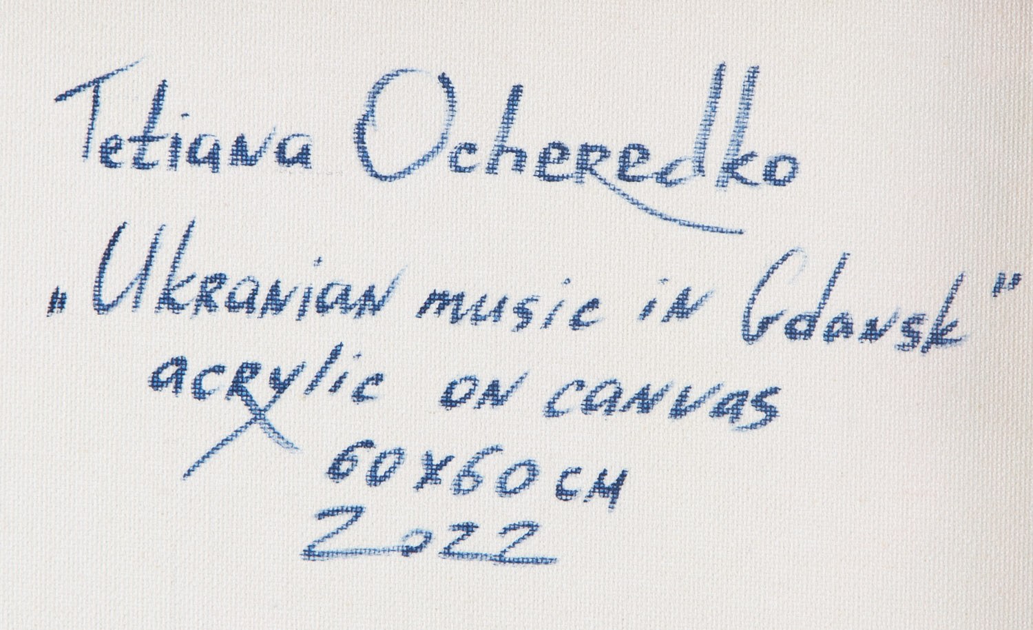 sygnowany, datowany i opisany na odwrociu: 'Tetiana Ocheredko | "Ukrainian music in Gdansk" | acrylic on canvas | 60 X 60 CM | 2022'