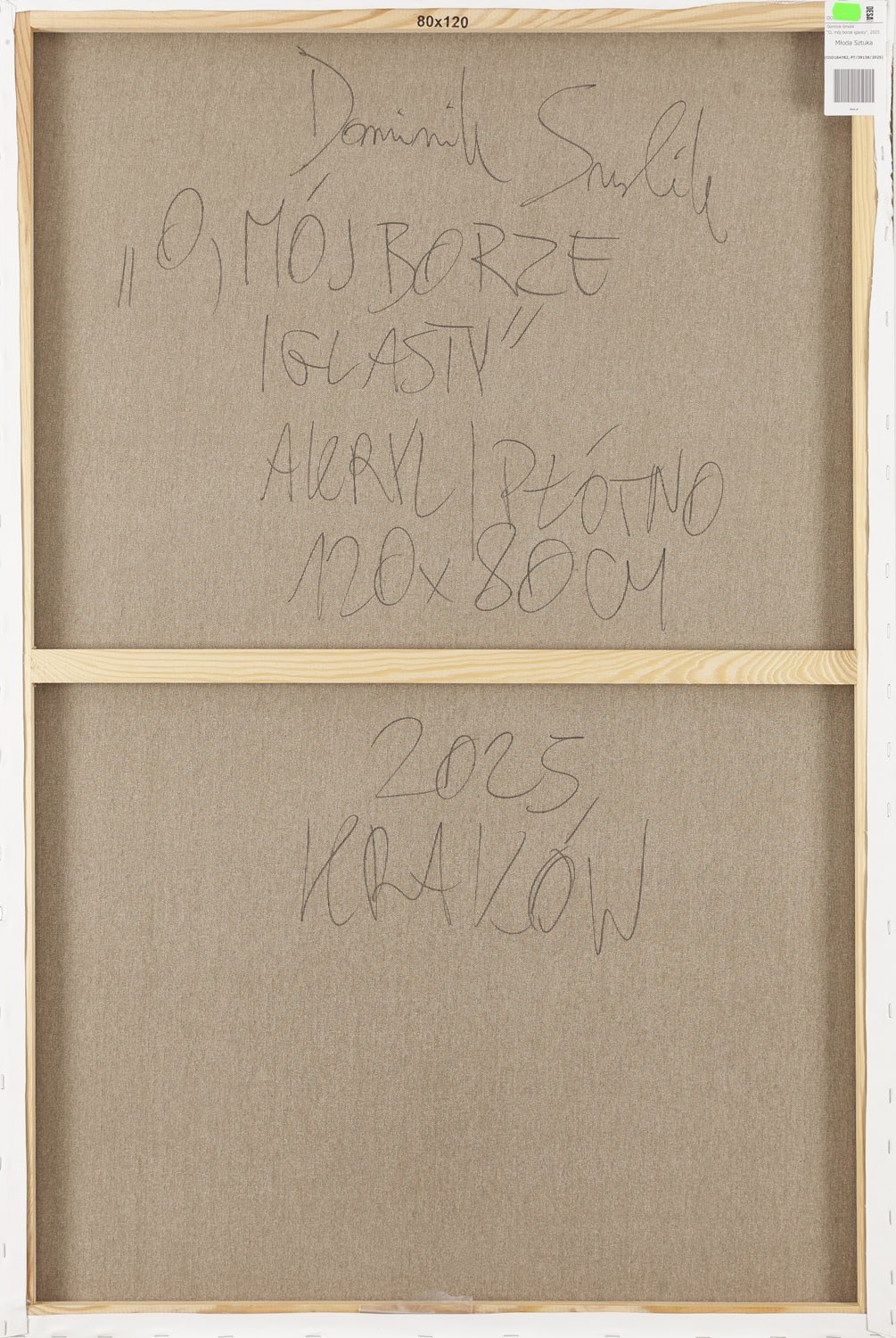 sygnowany, datowany i opisany na odwrociu: 'Dominik Smolik | "O, MÓJ BORZE | IGLASTY" | AKRYL/PŁÓTNO | 120X80CM | 2025 | KRAKÓW'