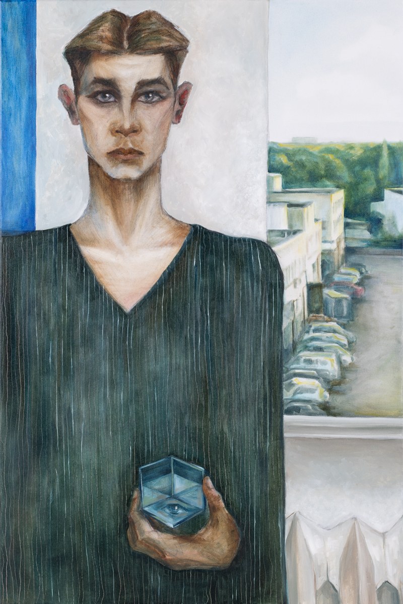 olej, płótno, 120x80 cm, opisany na odwrocie: Z, "Monsieur Z"/"Autoportret z artefaktem" Szczepan Zalewski