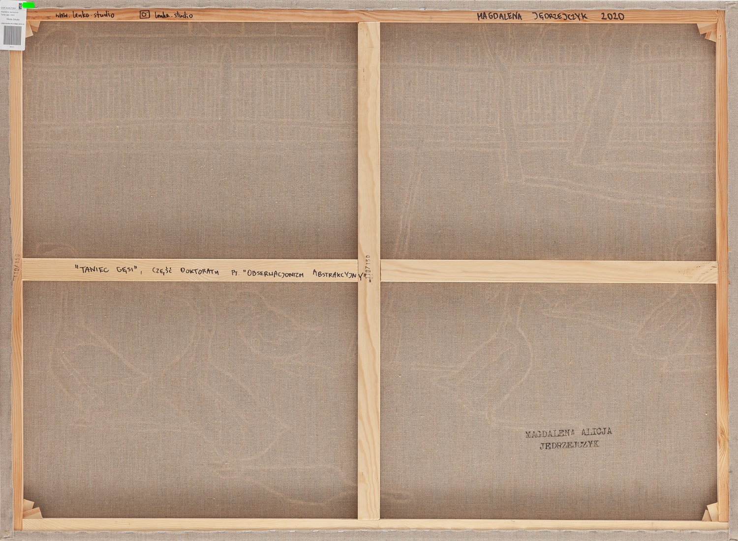 sygnowany, datowany i opisany na krośnie: 'MAGDALENA JĘDRZEJCZYK 2020 | "TANIEC GĘSI" CZĘŚĆ DOKTORATU PT "OBSERWACJONIZM ABSTRAKCYJNY"'