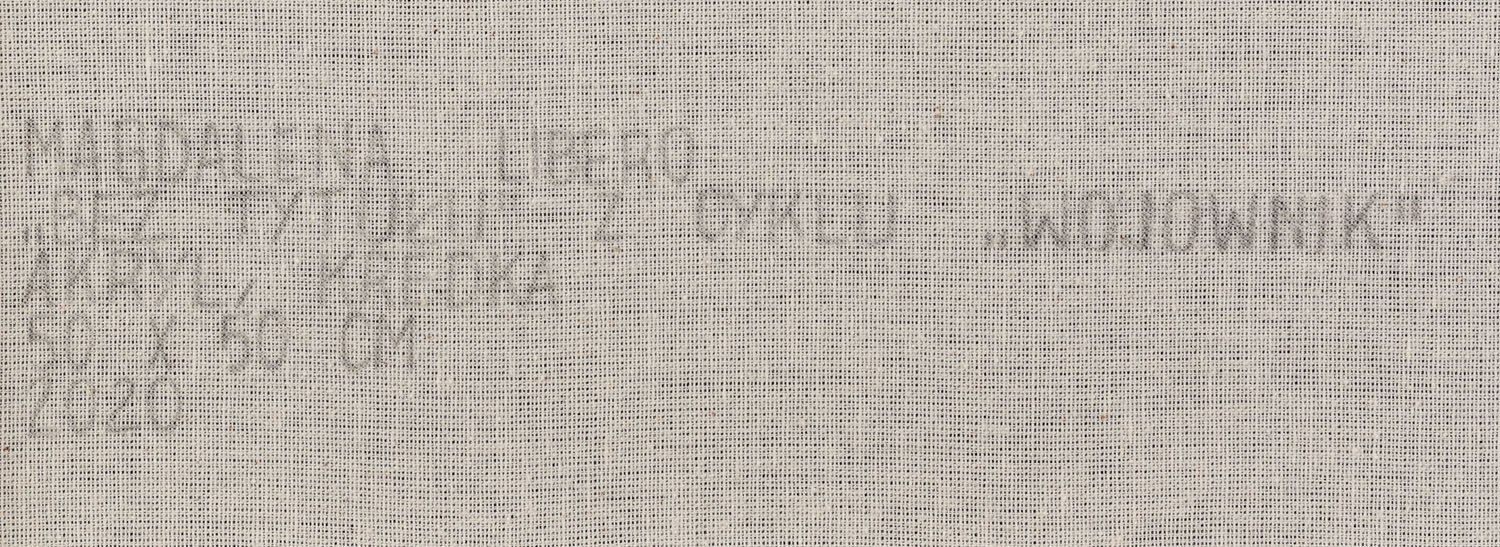 Wymiary: sygnowany, datowany i opisany na odwrociu: 'MAGDALENA LIBERO | "BEZ TYTUŁU" Z CYKLU "WOJOWNIK" | AKRYL, KREDKA | 50 x 50 CM | 2020'