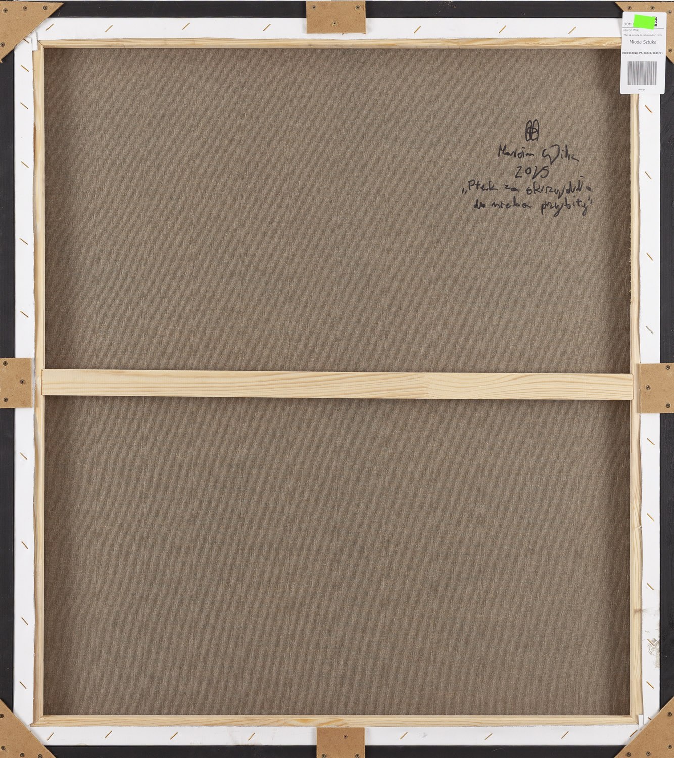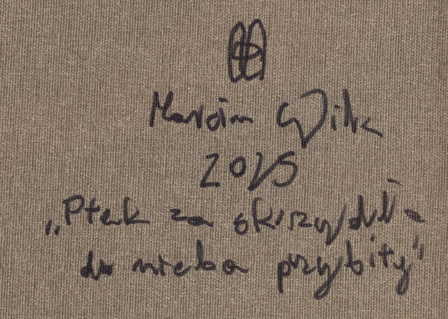sygnowany, datowany i opisany na odwrociu: '[monogram artysty] | Marcin Wilk | 2025 | "Ptak za skrzydła | do nieba przybity"'