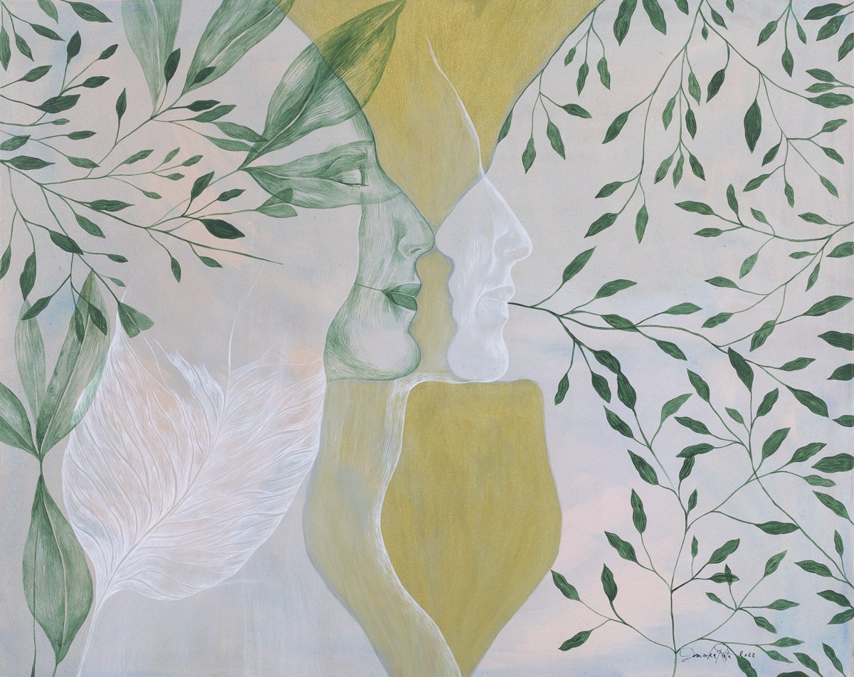 akryl, płótno, 80x100 cm, sygn. p.d.: Dominika Ruta 2022, opisany na odwrocie: Ruta Dominika 2022 "Spojrzenia wewnętrzne" I