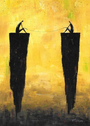 obraz malowany farbami akrylowymi i tuszem na tekturze introligatorskiej, rozmiar 21 x 29 cm, sygnowany