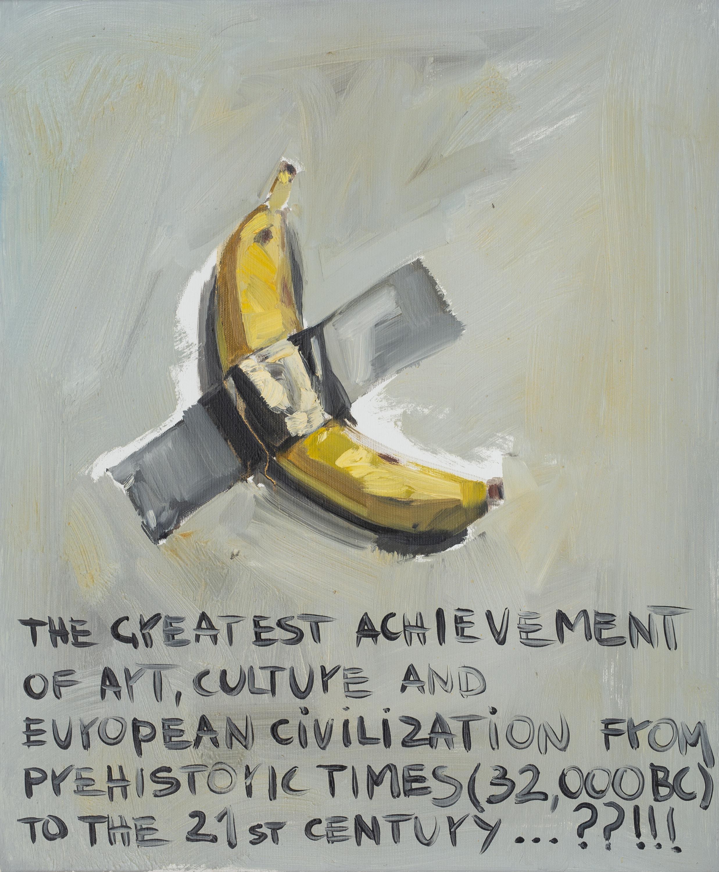 olej, płótno, 60 x 50 cm, sygnowany i opisany na odworcie: "Sztuka białego człowieka / | Tribute to Maurizio Cattelan | and Waldemar Łysiak" | The Krasnals | Whielki Krasnal'
