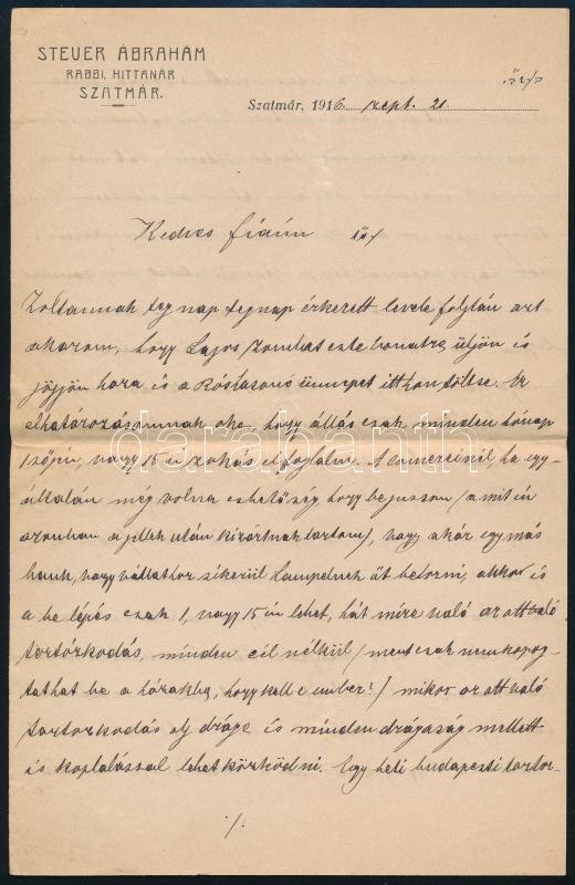 1916 Szatmár, Steuer Ábrahám rabbi, saját kezű levele fiának / Ábrahám Steuer rabbi's letter