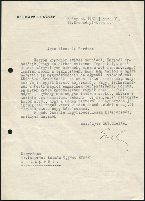 1939 Bp., Gratz Gusztáv külügyminiszter, író által aláírt levél