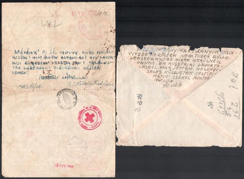 1945 Holocaust túlélő feljegyzése borítékon + 1943 vöröskereszt levél Palesztínából magyar zsidóktól rokonaiknak
