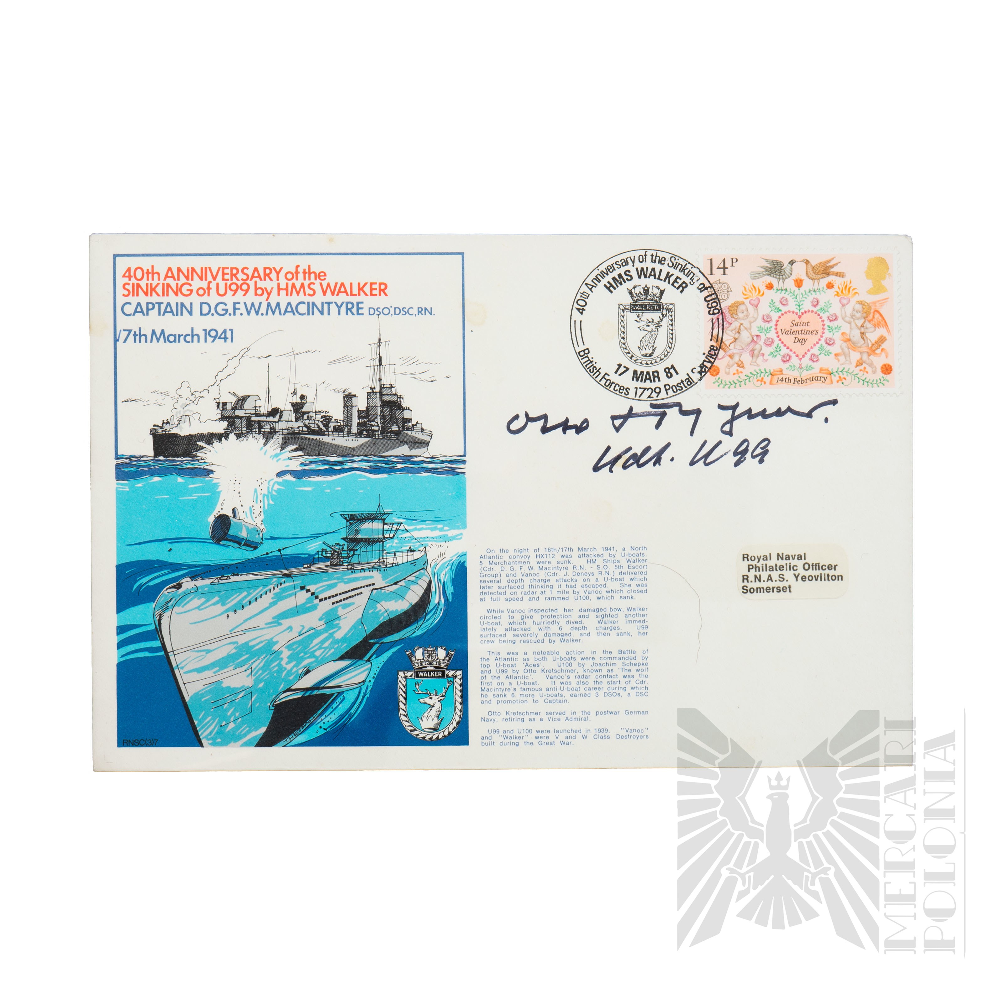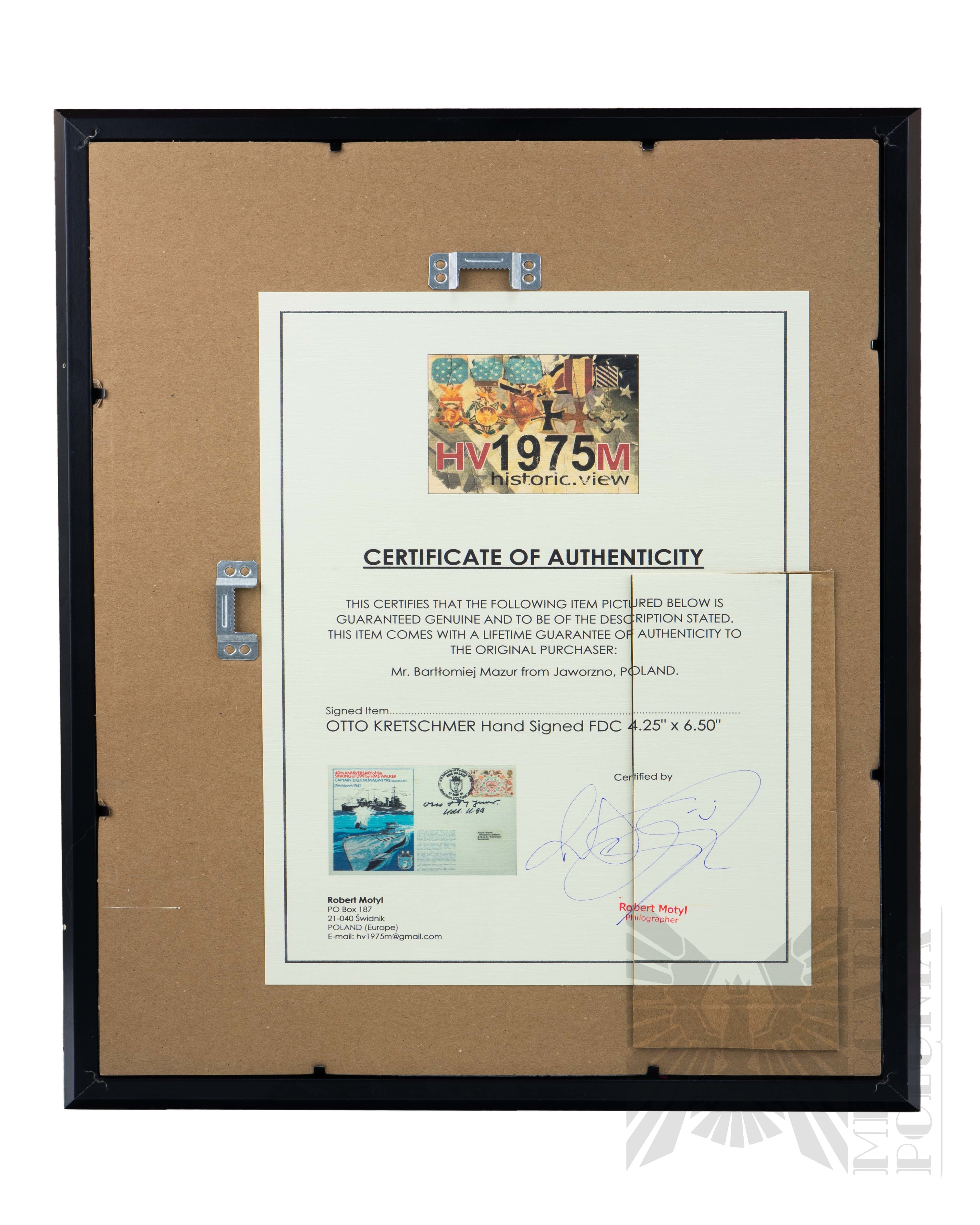 Oryginalny podpis legendarnego niemieckiego dowódcy okrętów podowodnych U-Bootów, zwanego Królem tonażu, podpis umieszczony na pocztówce. Podpis umieszczony w ramie wypełnionej kopiami odznak i odznaczeń, które otrzymał Otto Kretschmer.