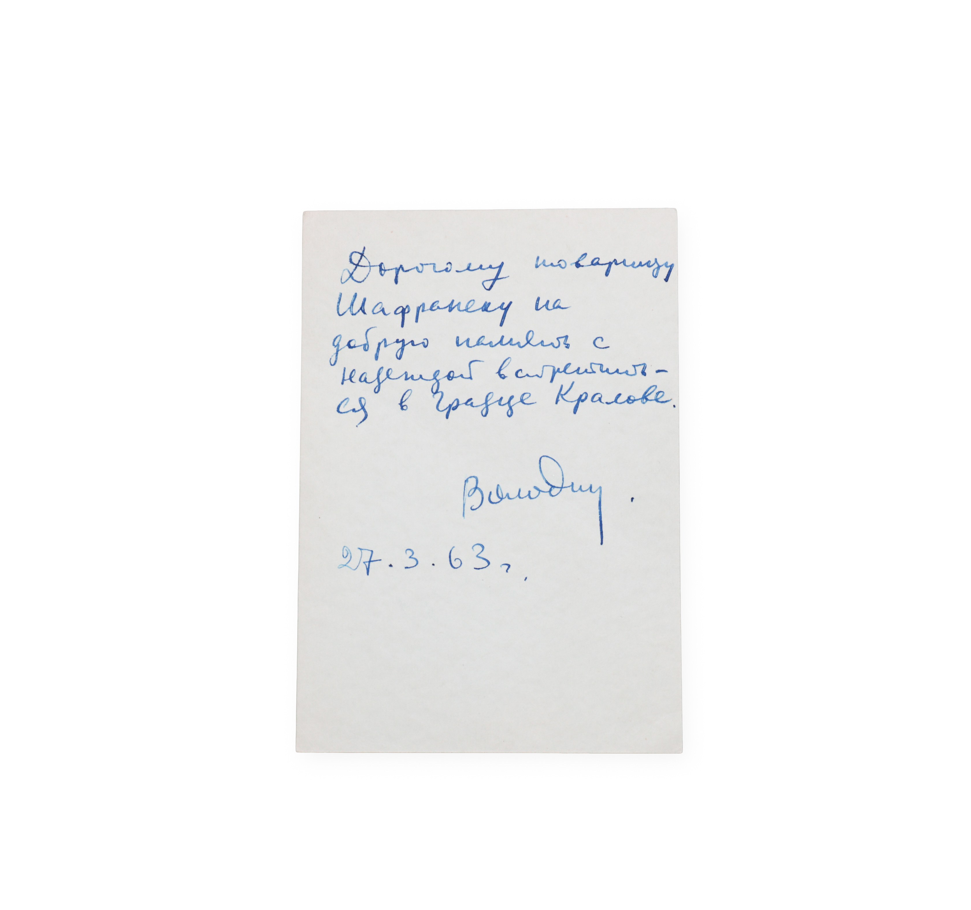 Signature of Alexander Mojseevich Volodin with a short manuscript in Russian on a cutting dated March 27, 1963. Volodin was a Russian playwright, screenwriter and poet, known for his psychologically sensitive plays reflecting on everyday life. His works are characterized by humanism, gentle humor and a deep understanding of human relationships in Soviet reality.Bidders are obliged to inform themselves about the condition of the lots before the auction, subsequent complaints will not be taken into account.