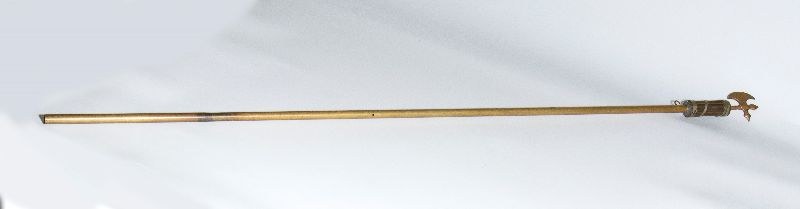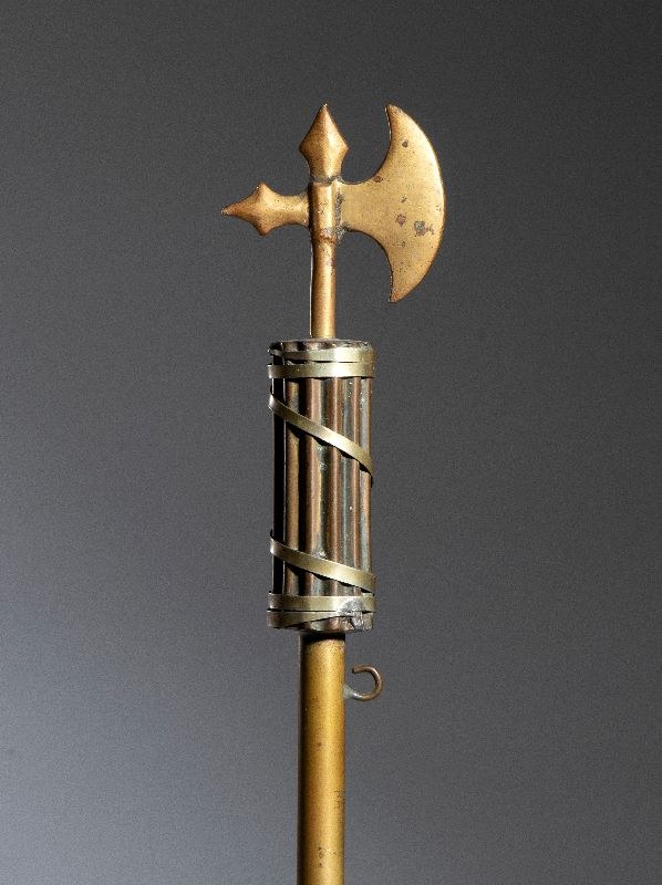 Flagpole or pennant, with a bronze tip in the shape of an early, primitive fasces, also used in the period before the March on Rome and in the years 1922-1927.The fasces measures approximately 16 cm, while the pole measures approximately 110 cm.Original, in excellent condition.