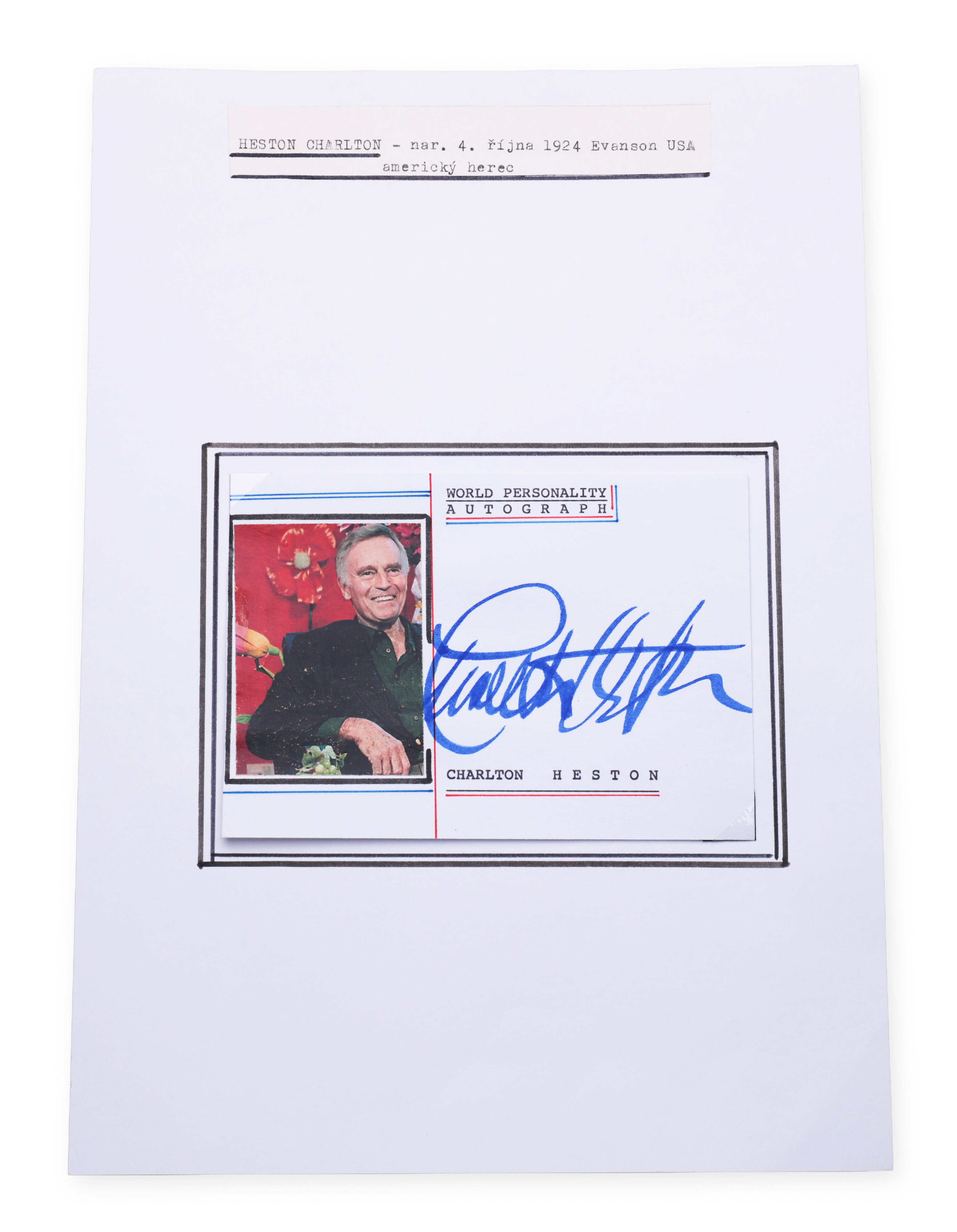 Charlton Heston's signature on a card placed on a collector's sheet. Charlton Heston was an American actor, Oscar winner, known for his monumental roles in films such as "Ben-Hur", "The Ten Commandments" or "Planet of the Apes". His signature represents a valuable collector's item associated with one of the most distinctive personalities of classic Hollywood.Bidders are obliged to inform themselves about the condition of the lots before the auction, subsequent complaints will not be taken into account.