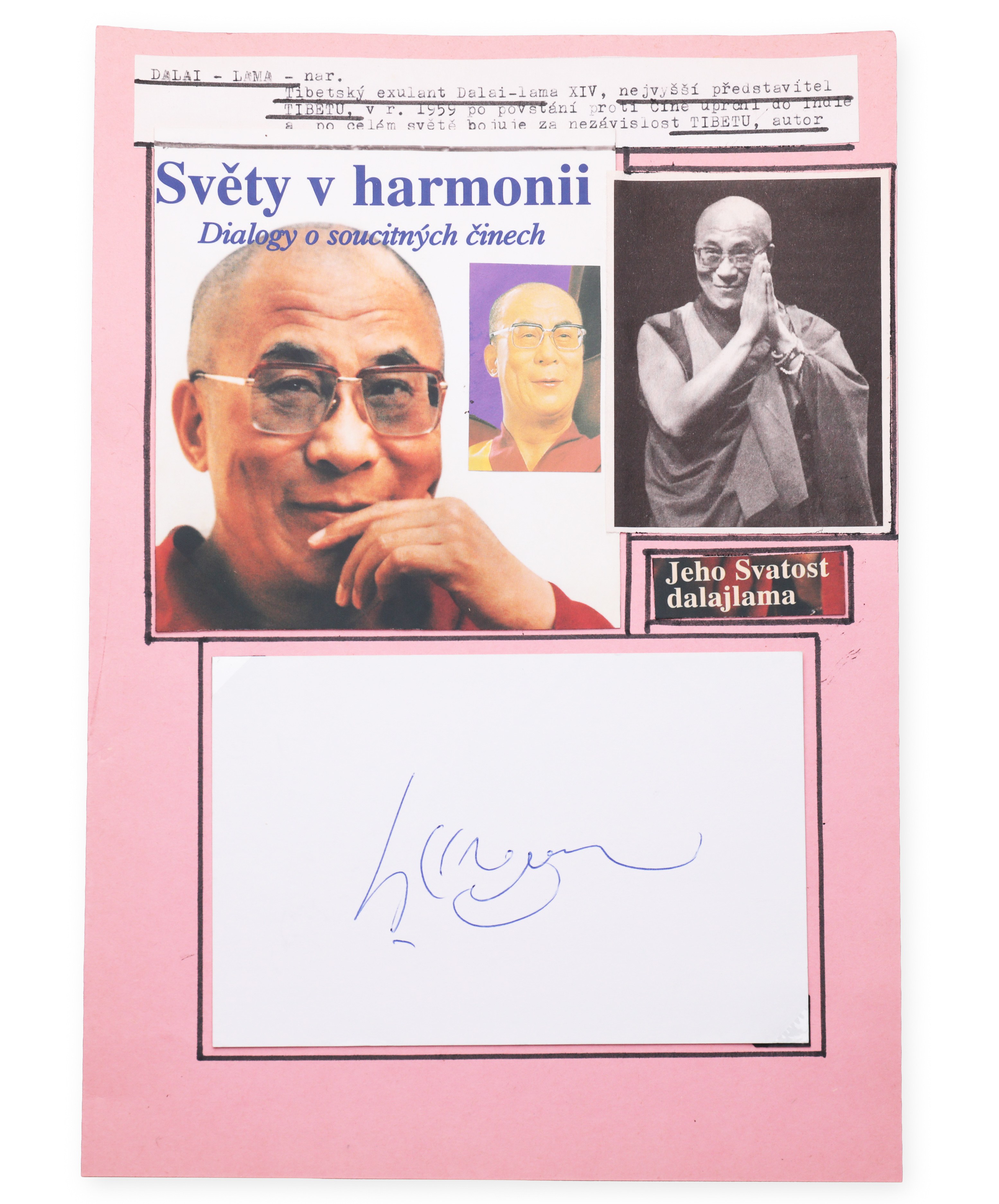 The signed clipping on the personality collector's sheet bears the signature of Tändzin Gjamccha, the fourteenth Dalai Lama, spiritual leader of Tibetan Buddhism and winner of the Nobel Peace Prize in 1989. He was born in 1935 and after fleeing Tibet in 1959 lives in Dharamsala, India. It is a globally recognized symbol of non-violence, spiritual compassion and the struggle for freedom of the Tibetan people.Bidders are obliged to inform themselves about the condition of the lots before the auction, subsequent complaints will not be taken into account.