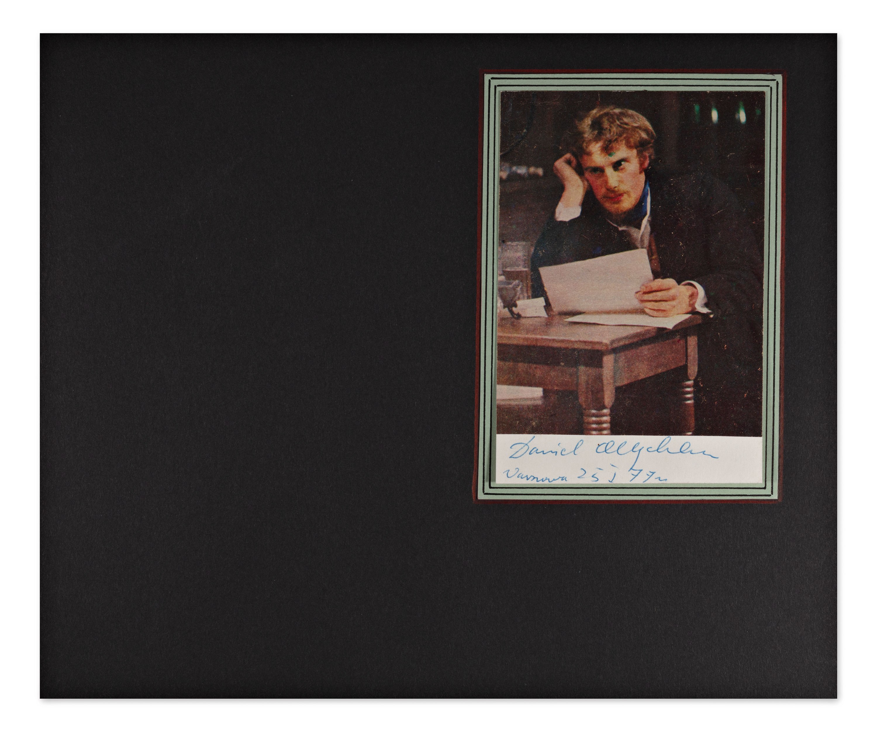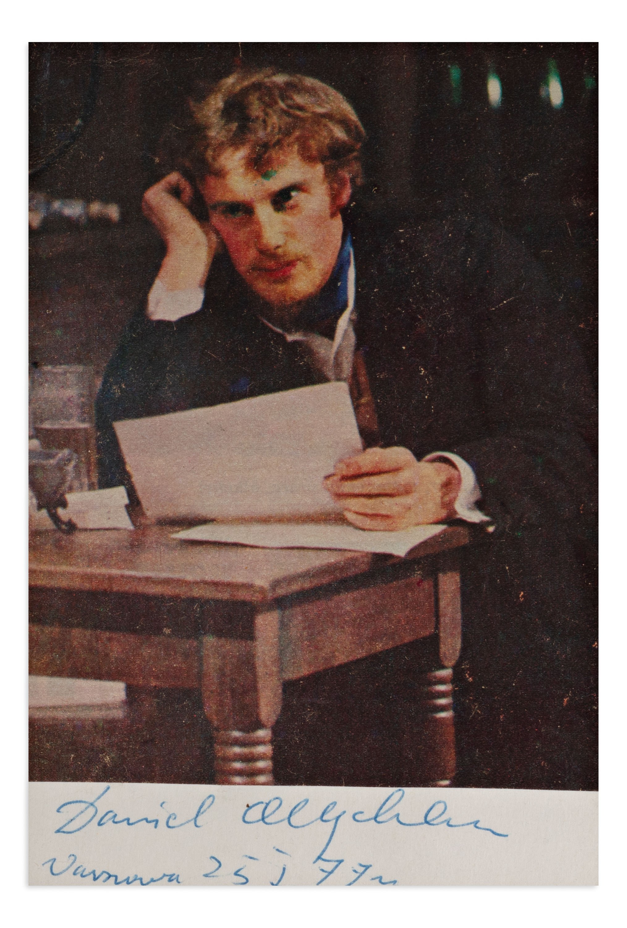 Reproduction of a color photograph of Polish actor Daniel Olbrychski, signed in blue ink and dated Warsaw, January 25, 1977.In the photograph, Olbrychski is captured in a dramatic pose while reading a letter, likely from one of his iconic film roles.